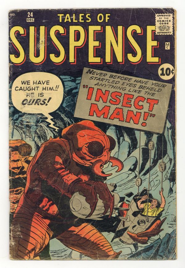 Starts Mar 16 Cover pencils by Jack Kirby, inks by Dick Ayers. "The Insect Man," pencils by Jack Kirby, inks by Dick Ayers; A soldier is placed underground in a capsule to test the effects of isolation; He is attacked by a telepathic insect. "Mystery Pupil" text story, art by Joe Maneely. "Beware... the Ticking Clocks!", pencils by Jack Kirby, inks by George Klein; A king is beset by an assassin in the king's clockroom whereupon the assassin is magiked into yet another figurine upon the king's favorite timepiece. "Something Lurks in the Fog!", art by Don Heck; An unrepentant con-man is scared straight when he strays onto a forbidden road and enters a world between life and death. "Long Live the King!", script by Stan Lee, art by Steve Ditko; A greedy prince marries a dowager queen; He tries to use her sleepwalking to cause her death, but the portrait of her husband calls out to warn her, and ghostly hands push the prince to his death. 36 pages, full color. Cover price $0.10.
