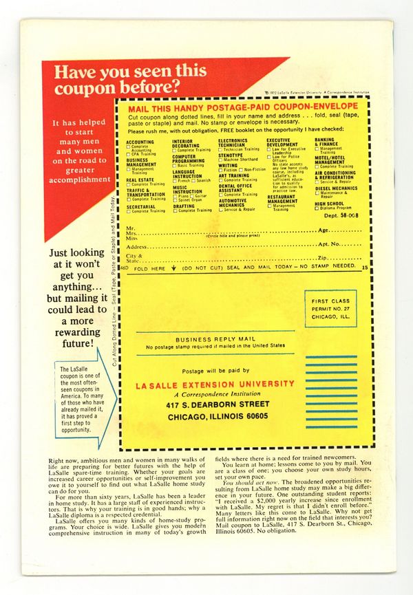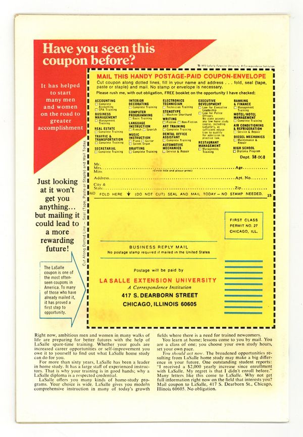 Starts Dec 22 Cover pencils by Marie Severin, inks by Joe Sinnott. Batroc, Whirlwind, and Porcupine team up against Captain America in "Up Against the Wall," script by Stan Lee, pencils by Gene Colan, inks by Dick Ayers; Captain America stumbles onto the Hood's plan to convince students to riot at a Midwestern university; After rescuing a dean from said riot, Cap is asked to make public service announcement condemning the students; While he mentions that violence shouldn't be the answer, Cap mostly condemns the dean; The Hood hires Batroc's Brigade to attack Cap. Cameos by the Hulk and Peter Parker (Spider-Man). 36 pgs., full color. $0.15. Cover price $0.15.