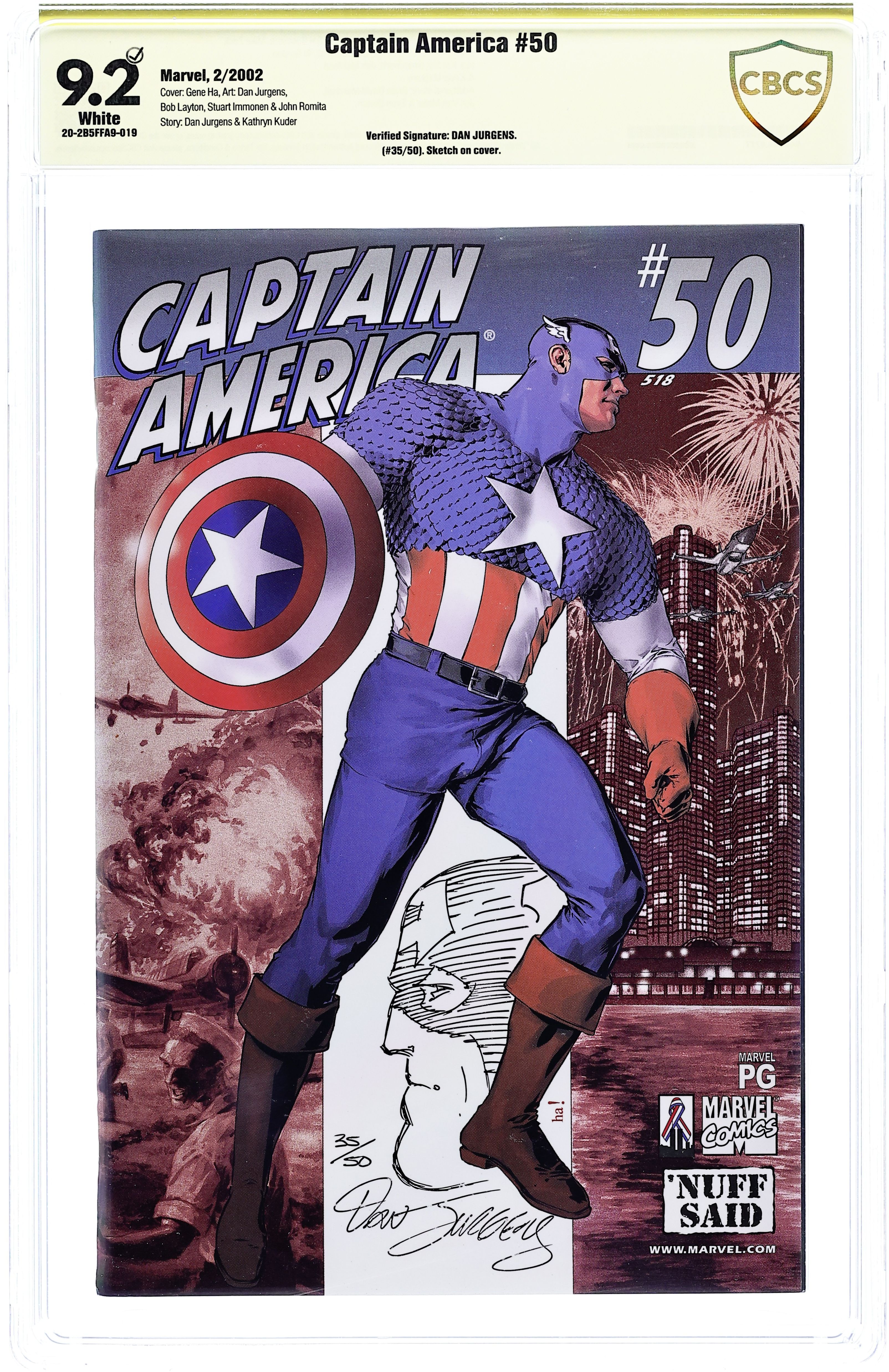 Final issue of the series - "Silent Night, Silent Morning" 'Nuff Said issue. Giant-Sized issue. Script by Dan Jurgens. Pencils by Dan Jurgens. Inks by Bob Layton. Cover by Gene Ha. In this silent Christmas tale (without words), a down on his luck family man helps Captain America survive an encounter with the always dangerous Absorbing Man. And by the story's end, a bonafide Christmas miracle occurs. Cameo appearance by Titania. Second story: "Keep in Mind" Script by Kathryn Kurder. Art by Stuart Immonen. Steve Rogers reflects upon his time in the European theater. Third story: "To the Core" Script and pencils by Dan Jurgens. Inks by Bob Layton. Cap brings Sharon Carter to a hidden SHIELD facility in Maine to show her just how much she means to him. Fourth story: "Relics" Script by Brian David-Marshall. Art by Igor Kordy. The Living Legend receives a late night call on his old Captain America hotline. Apparently, a terrorist group is attempting to set off a nuclear bomb in New Jersey. Cap rushes to the scene, but upon his arrival everything goes haywire. Cameo appearance by Nick Fury. Fifth story: "A Moment of Silence" Script by Jen Van Meter. Pencils by Brian Hurtt. Inks by Jim Mahfood. A school principal announces to his students that Captain America has died. Sixth story: "Stars and Stripes Forever" Script by Evan Dorkin. Art by Kevin Maguire. Heroes and villains from the Marvel Universe eulogize the Captain America after his apparent death in New Jersey. Seventh feature: Four-page sneak preview of Captain America: Dead Men Running #1. Eighth feature: One-page pin-up of Captain America by Danijel Žeželj. (Notes: The legacy numbering on the cover is in error. Captain America (3rd series) #50 is legacy issue 517. This issue includes a 4-page text feature detailing Dan Jurgens' plot for the first story. Captain America appears next in the Dead Men Running limited series and then returns in Captain America (4th series) #1 published in June 2002 under the Marvel Knights imprint. There are continuity discrepancies between the end of the 3rd series and the start of the 4th series. The letters page contains a statement of ownership: average print run 70,400; average paid circulation 51,803.) 96 pages. Cover price $5.95.
