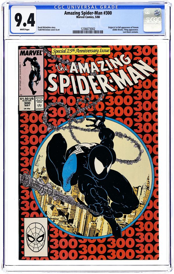 Ends Feb 2 7:25 PM CST Bid History 10 bids Current Bid $215 Your Secret Max Bid If you'd like to bid, please log in or register. Direct Edition. Giant-sized 25th anniversary issue. First full appearance of Venom in "Venom!", script by David Michelinie, art by Todd McFarlane; Spidey's old alien costume has merged with reporter Eddie Brock who thinks his career was ruined by Spider-Man and the symbiote of the two, Venom, takes on the web slinger; At MJ's request, Spidey returns to the blue and red costume as she now finds his black duds way too creepy; This is the last issue in which Spider-Man appears in his black costume; Thing (of the Fantastic Four) cameo.. Stan's Soapbox Special in place of letters page: Full page editorial by Stan on the occasion of Spider-Man's 300th issue. 52 pgs., full color. Cover price $1.50.