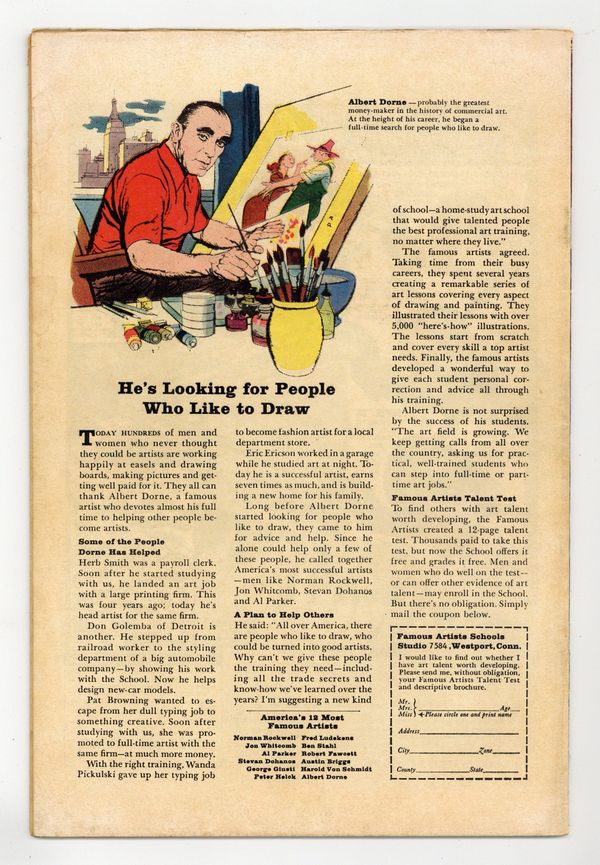 Starts Dec 8 Cover art by Bill Everett. "He Never Came Out!", art by Alphonso Greene; A wax museum owner claims that his statues are criminals petrified by the head of Medusa; When a thief ignores this warning and tries to rob him, the museum gains a new statue. "Uncork It...If You Dare!", art by Howard O'Donnell; A meek man is left a bottle of gas that changes personalities; Instead of using it to become more daring, he uses it on UN diplomats. "The Drowning Man!", art by Christopher Rule; A cafe owner comes across Atlanteans exiling some of their criminals; The guards save him from drowning and he is offered citizenship. "Flight Number Thirteen!", art by Ruben Moreira; Two criminals hijack an airplane full of strangely emotionless passengers; The airplane is piloted remotely into the parallel world that the passengers came from, where the air will drain the pilots' emotions. "The Melting Pot," art by John Forte; A convict creates a melting pot to free himself from jail to steal gold, but the pot melts the gold and leaves him trapped in molten metal. "The Free Ride" text story. "Too Good to Be True!", art by Don Perlin; A young boy imagines that he has a rich uncle who suddenly appears, but when he begins to doubt, the uncle fades away. 36 pgs., full color. Cover price $0.10.