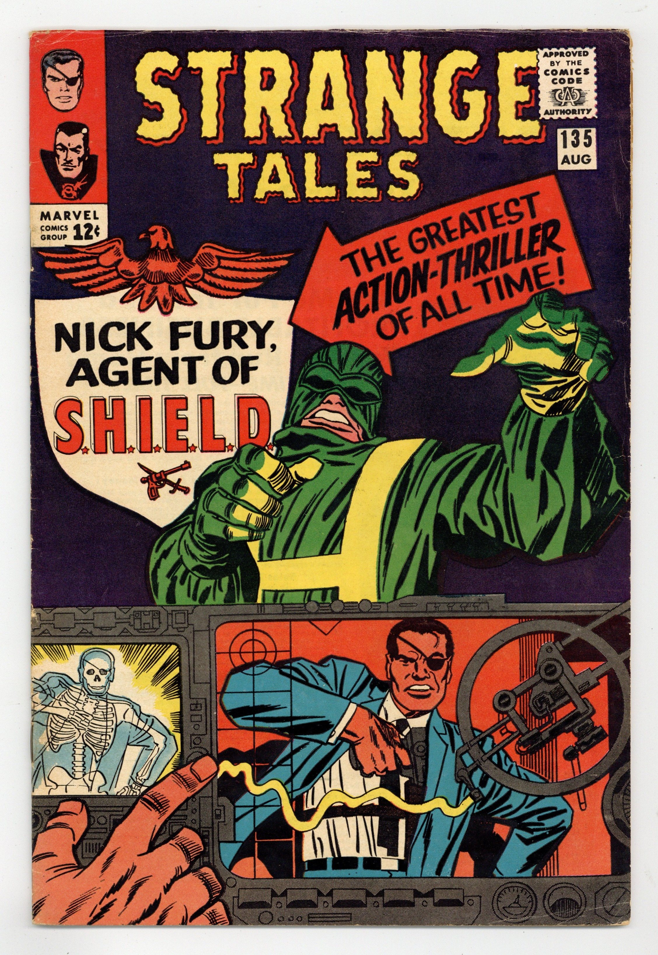 Starts Jan 26 Cover pencils by Jack Kirby, inks by Frank Giacoia. "The Man for the Job!", script by Stan Lee and Jack Kirby (co-plot), pencils by Jack Kirby, inks by Dick Ayers; Nick Fury reports to the Pentagon, encountering Life Model Decoys: replicas of himself; He is driven in a gadget-filled car that converts to flying mode; Fury learns about SHIELD, an international organization whose job is to stop HYDRA, fanatics bent on world domination; Fury meets Tony Stark, in charge of SHIELD's weaponry, who tells Fury he was chosen to lead SHIELD. "Eternity Beckons!", script by Steve Ditko (plot) and Stan Lee (dialogue), art by Steve Ditko; In London, seeking info on "Eternity," Dr. Strange goes to the secluded home of Sir Baskerville, a former disciple of Mordo's, who greets him as an old friend; Meanwhile, Dormammu discovers that Clea set the Mindless Ones free and swears she will pay for her betrayal; Baskerville contacts Mordo, who sends an emissary to trap Strange but it backfires, allowing Strange to discover that Dormammu is the one behind Mordo's attacks and increased power. Notes: 1st S.H.I.E.L.D., 1st Hydra, 1st Nick Fury as agent of shield, 1st appearance of LMD (Life Model Decoy). 36 pgs., full color. Cover price $0.12.