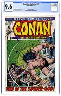 Newsstand Edition. Cover pencils by John Buscema, inks by Ernie Chan. Belit guest stars in Devil-Crabs of the Dark Cliffs! Script by Roy Thomas, pencils by John Buscema, inks by Ernie Chan; setting: Tigress & Cave on the Black Coast; Belit & Conan rescue Argossean sailors from Crab-Men by steaming them alive; Conan has a weird fainting spell on the last page; adapted from the story "The People of the Black Coast" by Robert E. Howard. Spider-Man stars in a one-page Hostess ad, Hotshot on the Block. Jack Davis on the Spalding back cover ad. 36 pgs. Cover price $0.40. Cover price $0.40.