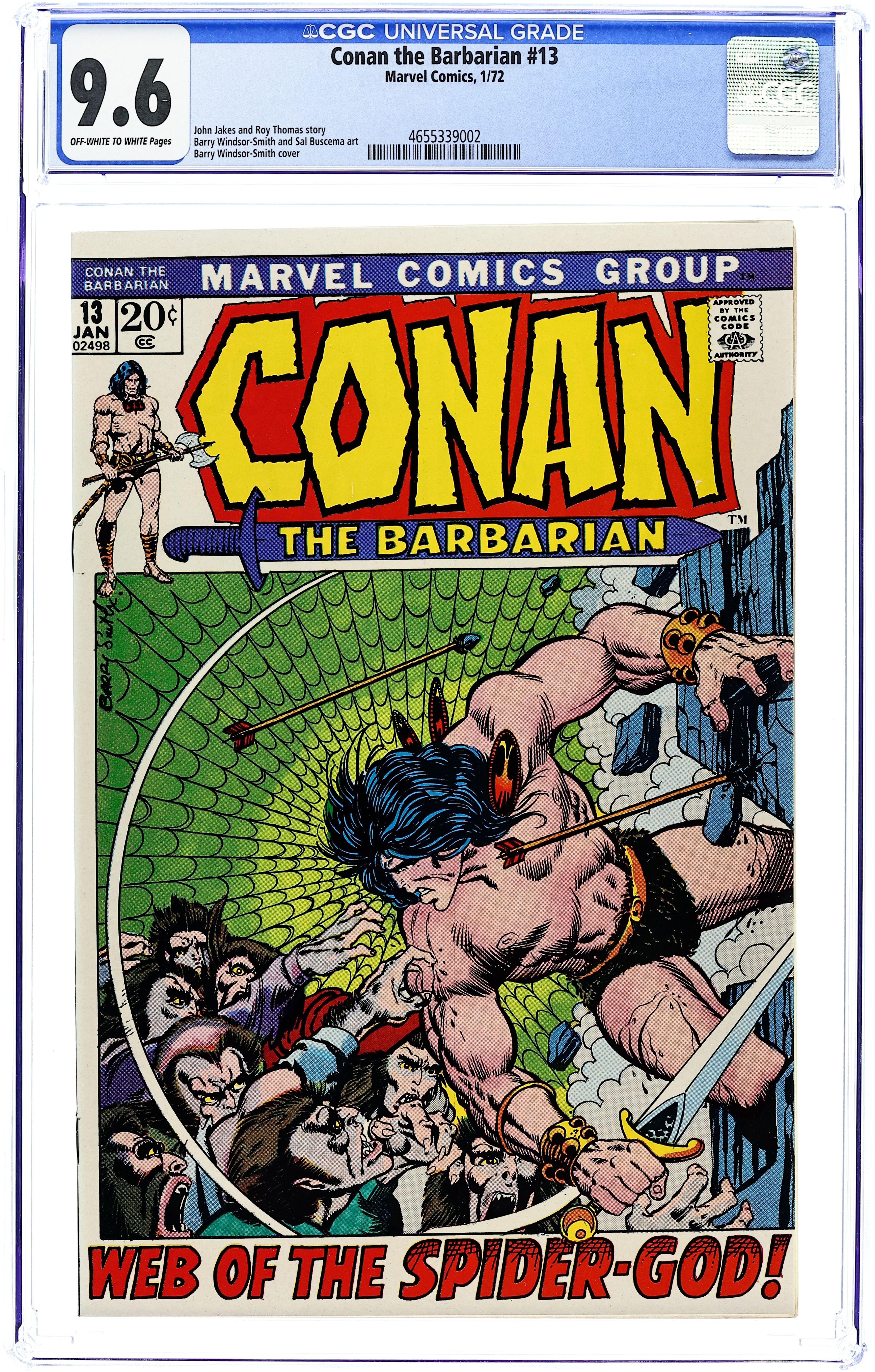 Cover art by Barry Windsor-Smith. Web of the Spider-God, plot by John Jakes, script by Roy Thomas, pencils by Barry Windsor-Smith, inks by Sal Buscema; setting: desert east of Ophir & city of Yezud; Conan is delirous in desert, Thanix saves his life; Conan fights Omm (giant spider), Tork destroys Yezud and leaves for Shadizar with Lea. 36 pgs. Cover price: $0.20. Cover price $0.20.