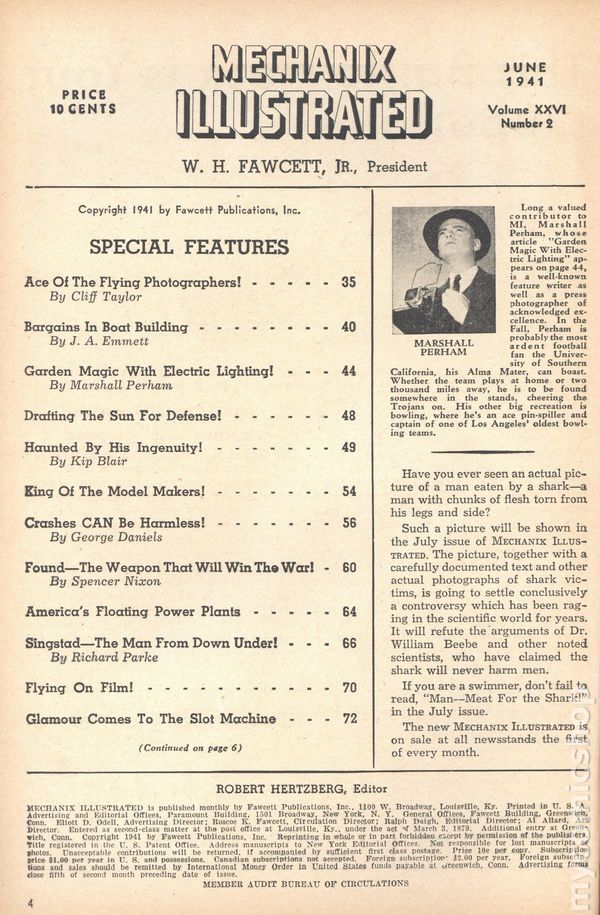 View scansVolume 26, Issue 1 - May, 1941. Mechanical science and technology magazine. This issue's articles include; "Spindizzies - 100MPH or Bust!" by John Q. Copeland, "A Ship is Launched" by Lester David, "Paradise for Sunday Drivers" by Bob Ruskauff, "The Following is Transcribed - " by Ronald Banks, "Blasting the Bombers!" by Douglas Rolfe, "America Beats Off an Air Raid!" by Cliff Taylor, "Tune Up Your Car the Modern Way" by Fred C. Russell, and others. 6 1/2-in. x 9 1/2-in., 162 pages, BW/spot color. Cover price $0.10.