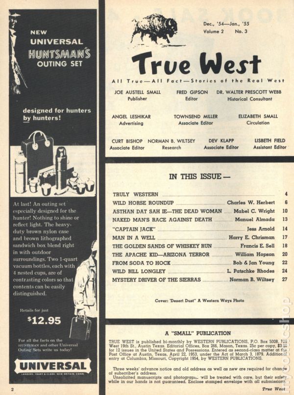 Issue #12. December 1955. Magazine with articles and history relating to the American West. 8.5" x 11". 48 pages. Black and white. Cover price $0.25.