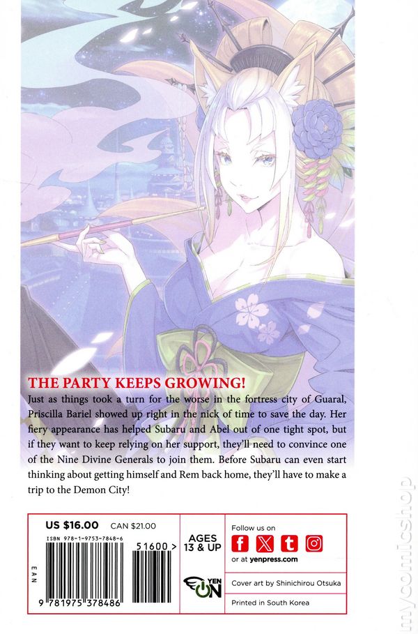 Volume 16 - 2nd and later printings. Written by Tappei Nagatsuki. Art and cover by Shinichirou Otsuka. Translated by Dale DeLucia. One year after the battle in the Sanctuary, a message arrives from Anastasia-an invitation for Emilia and her supporters to visit the city of Priestella. There, they will meet many familiar faces and see many amazing sights. As they take in the sights and rekindle old friendships, malevolent forces lurk behind the scenes. What new tragedy does fate have in store for them? Softcover, 5-in. x 8-in., 240 pages, Text (with B&W Chapter Illustrations). Age 13 and Up Cover price $14.99.