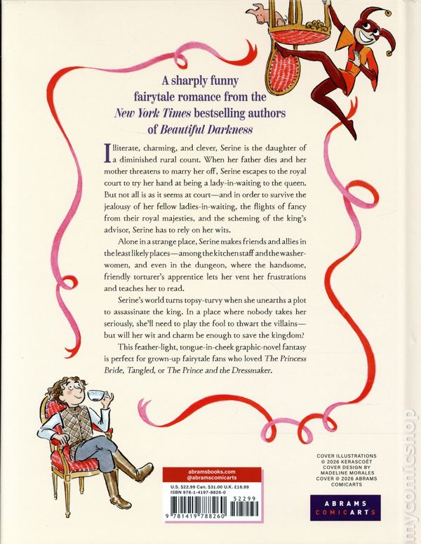 1st printing. Written by Flore Vesco. Art and cover by Kerascoet. From the New York Times bestselling illustrators of Beauty and Beautiful Darkness comes a fleet, tongue-in-cheek adult fairy tale graphic novel where love is found in the least likely places and nothing is quite what it seems . . .This lighthearted, sharply witty adult fairy tale is a delightful and quirky take on toxic workplaces, with a dash of Puss in Boots–style antics and a little romance thrown in for good measure. Serine is a poor but plucky daughter of a sickly nobleman who must make her way in the royal court to avoid being married off once her father dies. Although she is illiterate and owns only one dress, she manages to charm her way into the fickle queens good graces—but the royal court is not a kind place for a country bumpkin. Silly, sweet Serine must smarten up if she wants to survive the queens fits of pique, the court ladies gossip, and the royal advisors evil schemes. With nothing but her wits and the help of the friendly, handsome torturers apprentice, can she find a way to save her job, save the kingdom, and find true love along the way? Or will she be forced to play the fool? Hardcover, 7-in.x 9 1/2-in., 112 pages, full color. Teen Cover price $22.99.