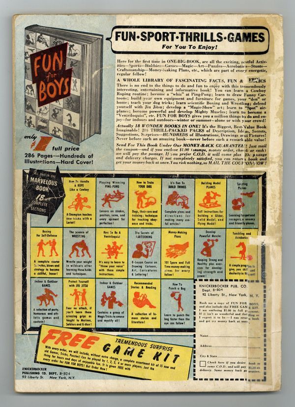 Starts May 11 Cover by C.C. Beck. Stories and art by C.C. Beck and Otto Binder. Fawcett's first squarebound comic is an anthology of its greatest superheroes, including Bulletman, Spy Smasher, and of course the original Captain Marvel (Shazam). Captain Marvel meets the multi-armed inhabitants of Mars, and teaches them to play baseball. When the aptly named Judge Lynch snaps and begins taking the law into his own hands, Bulletman and Bulletgirl must stop him. Captain Marvel Jr. battles Mr. Morpheus, who uses his power to control dreams to steal US defense secrets for the Nazis. Captain Marvel Plays Baseball on Mars; The Adventures of Silent Sims; Captain Midnight: The Race Around the World!; Bulletman: Meets Judge Lynch!; Flowers of Death; Spy Smasher: The Filming of Spy Smashers Fall!; Golden Arrow: The Feud That Fizzled!; Captain Marvel Jr.: Beware Mr. Morpheus. Final issue of the series. 96 pages, Full Color. Cover price $0.15.