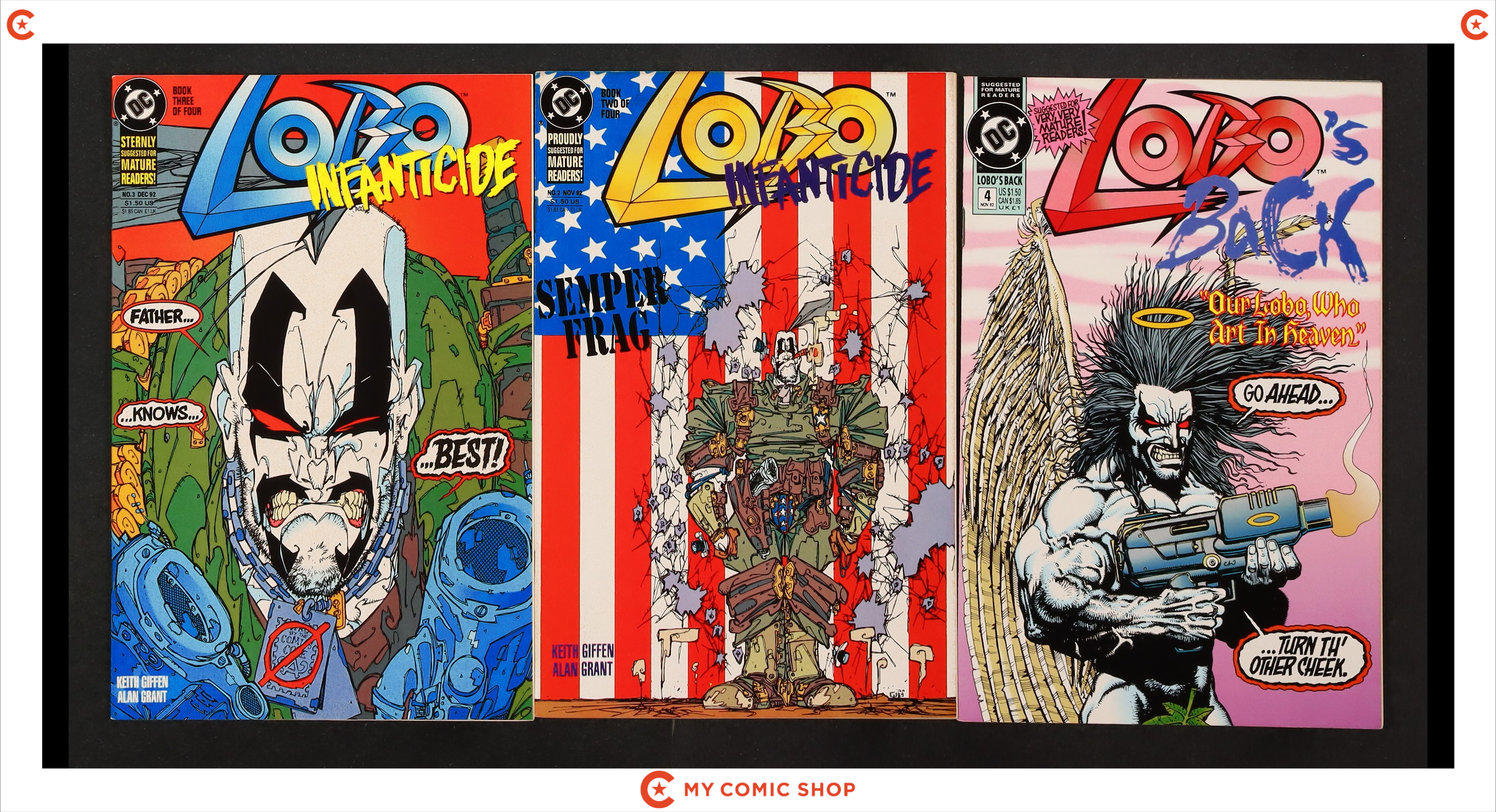 issue 0 of Lobo (1993 2nd Series DC), issue 1 of Lobo Portrait of a Victim (1993), issue 1 of Lobo Convention Special (1993), issue 4 of Lobo Unamerican Gladiators (1993), issues 1, 2, 4 of Lobo's Back (1992 DC), and issues 2, 3 of Lobo Infanticide (1992). Most will grade in the FN to VF range.