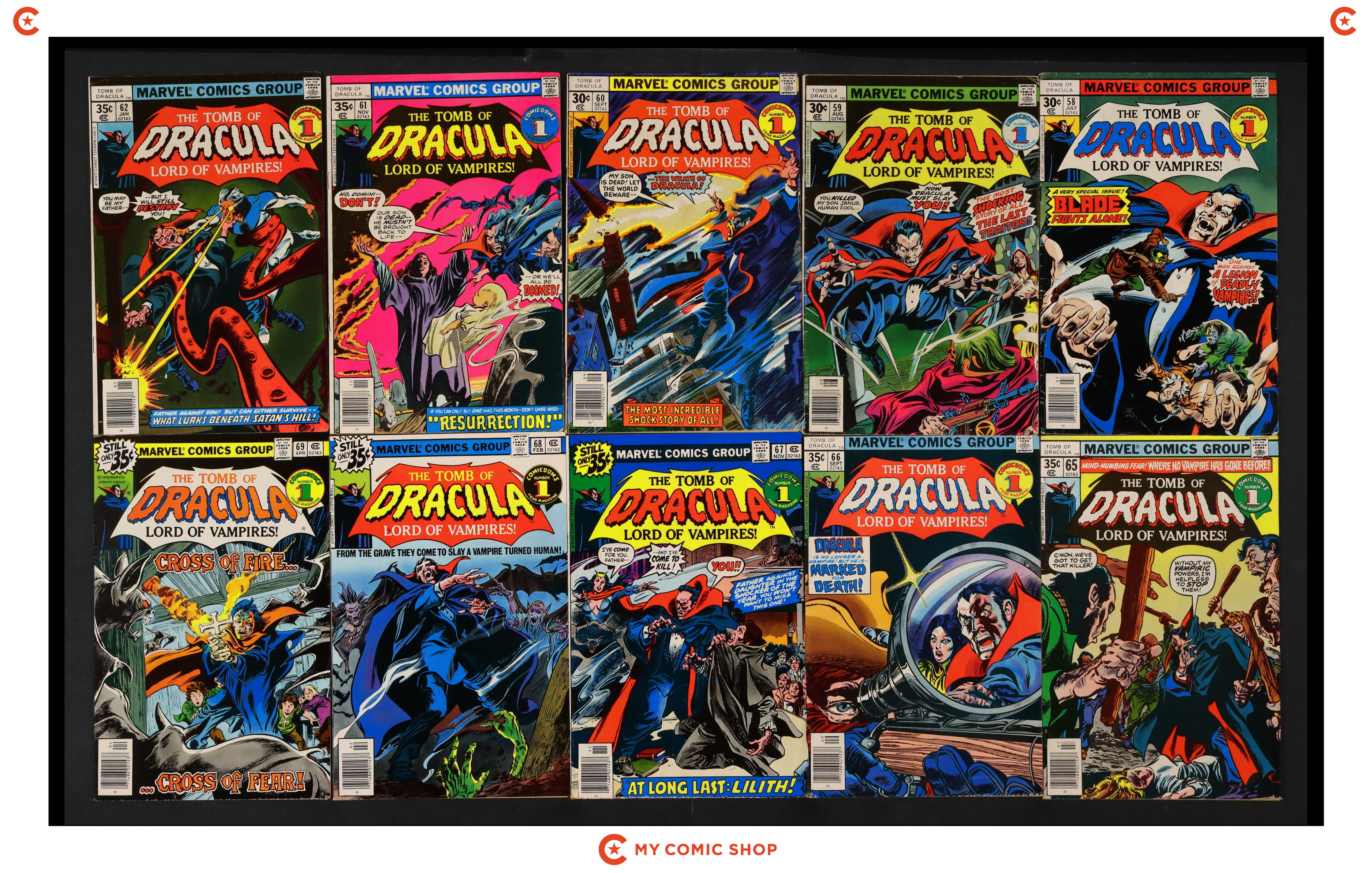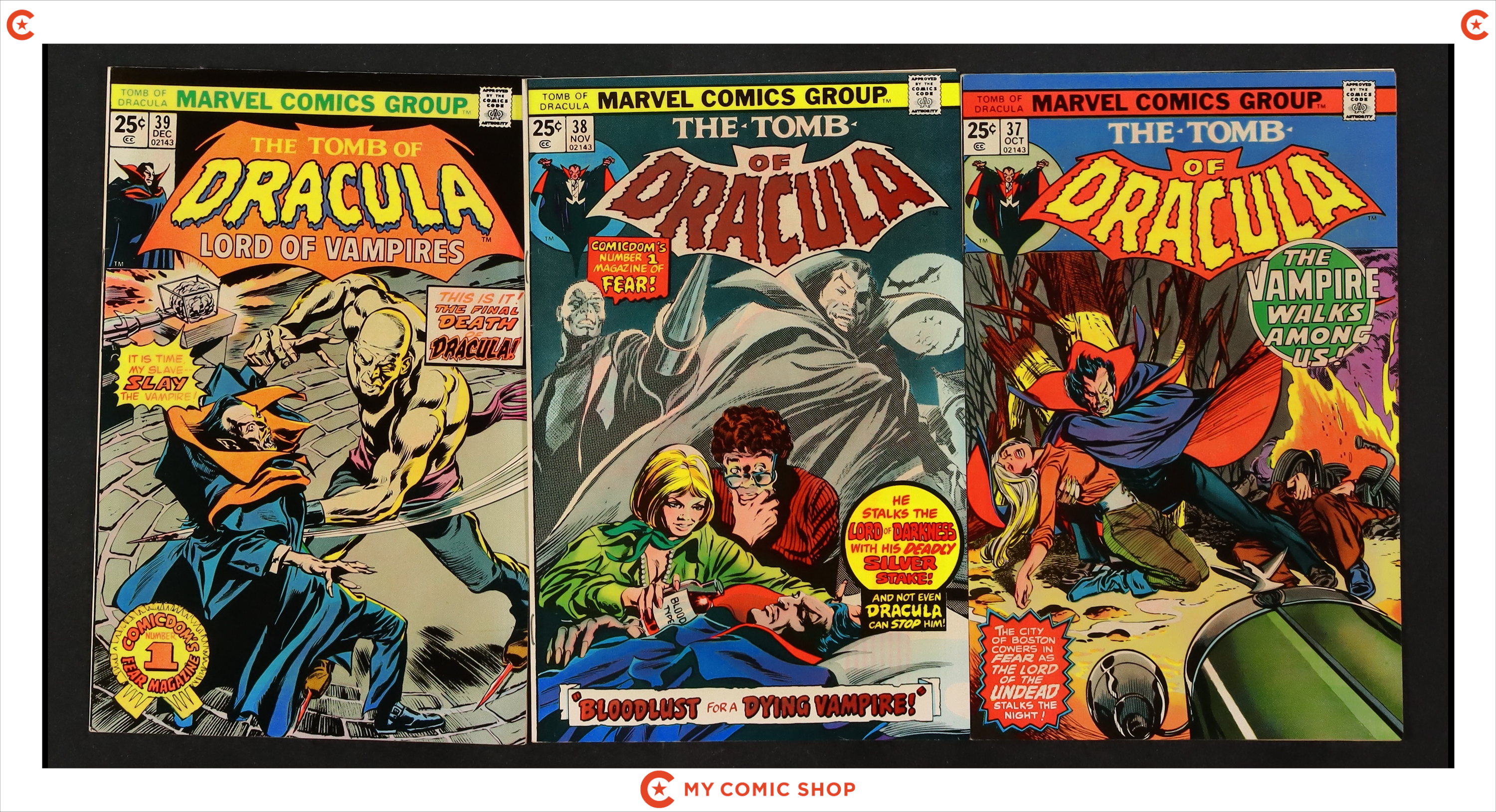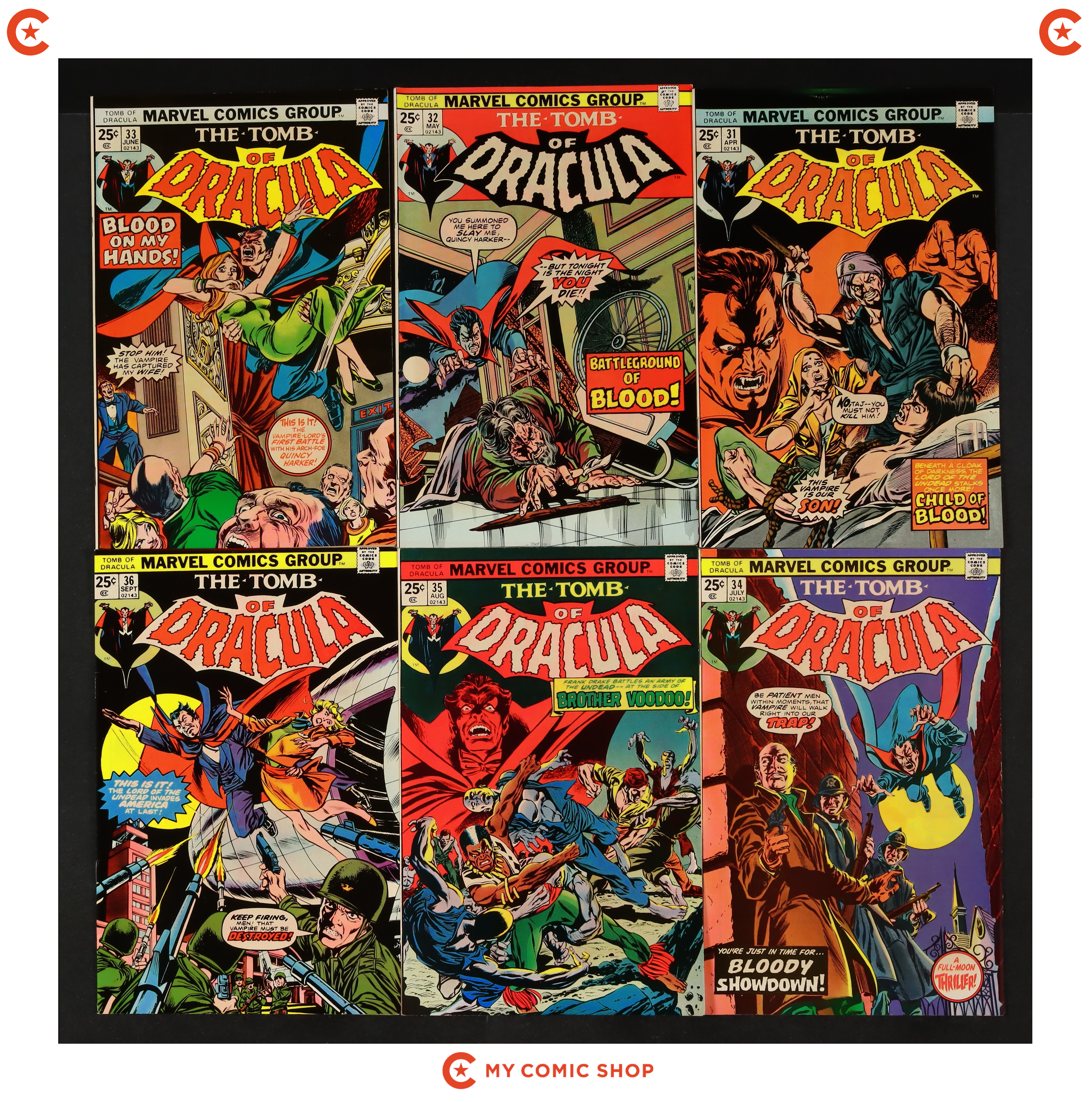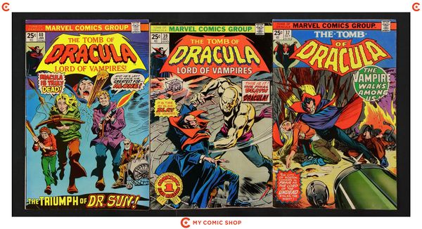 Issues 31-39 of Tomb of Dracula (1972 1st Series). Most will grade in the FN range.