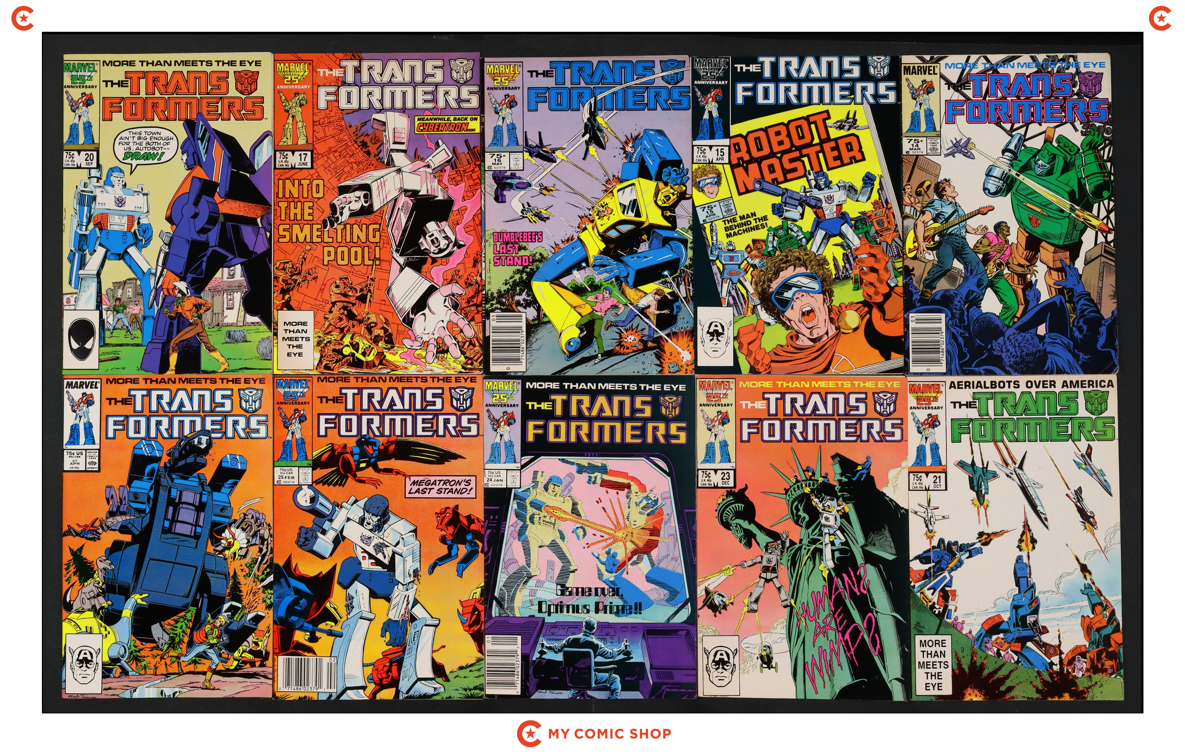 Issues 14-17, 20D, 21, 23D, 24, 25N, 27D of Transformers (1984 Marvel). Most issues will grade in the VG to FN range.