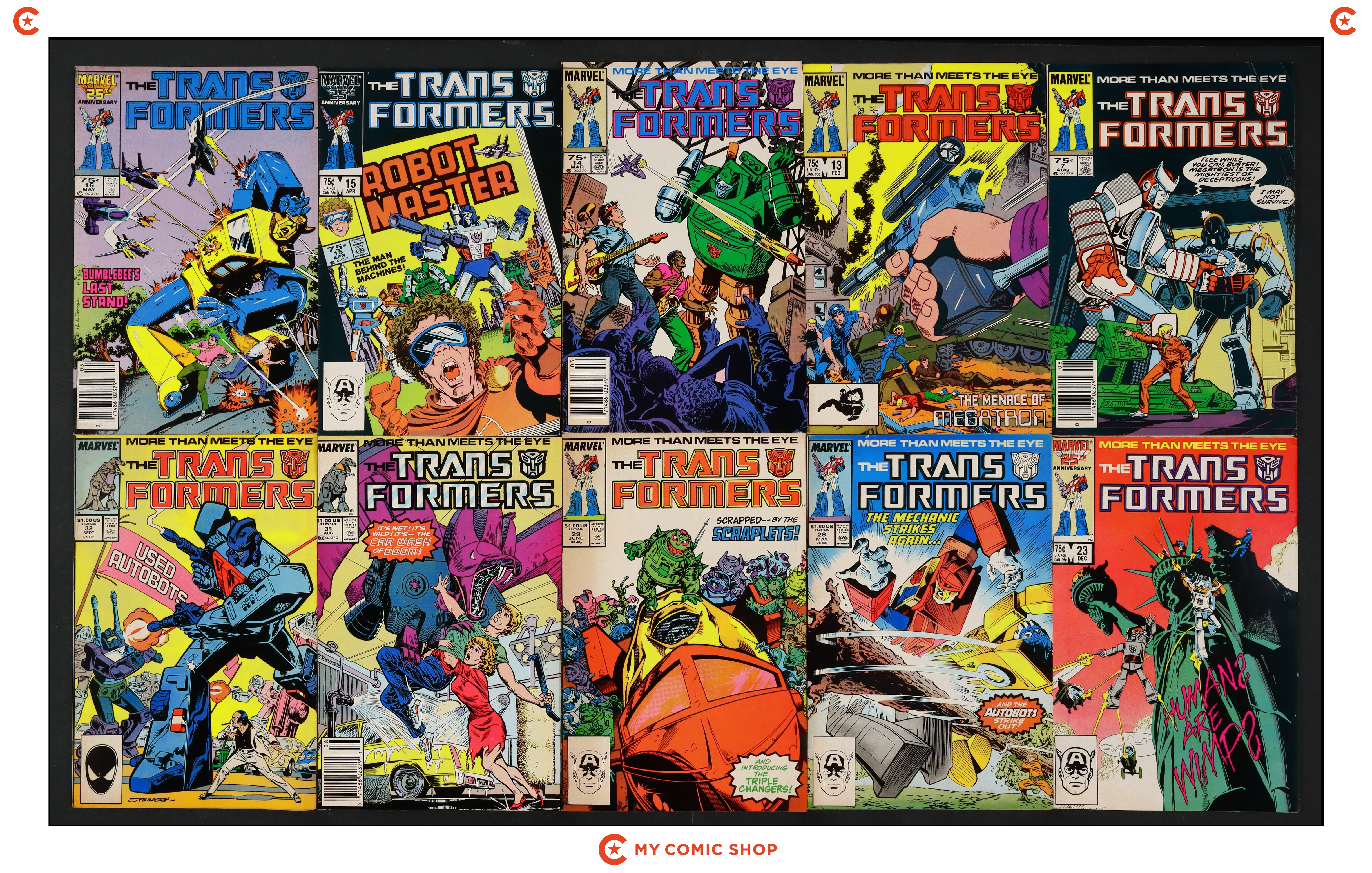 Issues 7, 13-16, 23D, 28D, 29D, 31, 32 of Transformers (1984 Marvel). Most will grade in the VG to FN range.