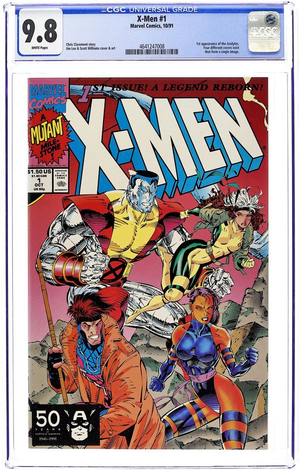 Starts Apr 4 Direct Edition. Colossus/Gambit/Psylocke/Rogue cover. Cover pencils by Jim Lee (signed), inks by Scott Williams. Rubicon, script by Jim Lee (Co-Plot) and Chris Claremont, pencils by Jim Lee, inks by Scott Williams; Magneto forms the Acolytes and proclaims Asteroid M a haven for mutants everywhere; But the rest of the world doesn't see it that way; Nick Fury cameo. 2-page pin-up: gallery of X-Men villains. X-Men Sketchbook by Jim Lee. Cover price $1.50. NOTE: Cover B connects to covers 1A, 1C, and 1D to form a single giant image. Cover price $1.50.