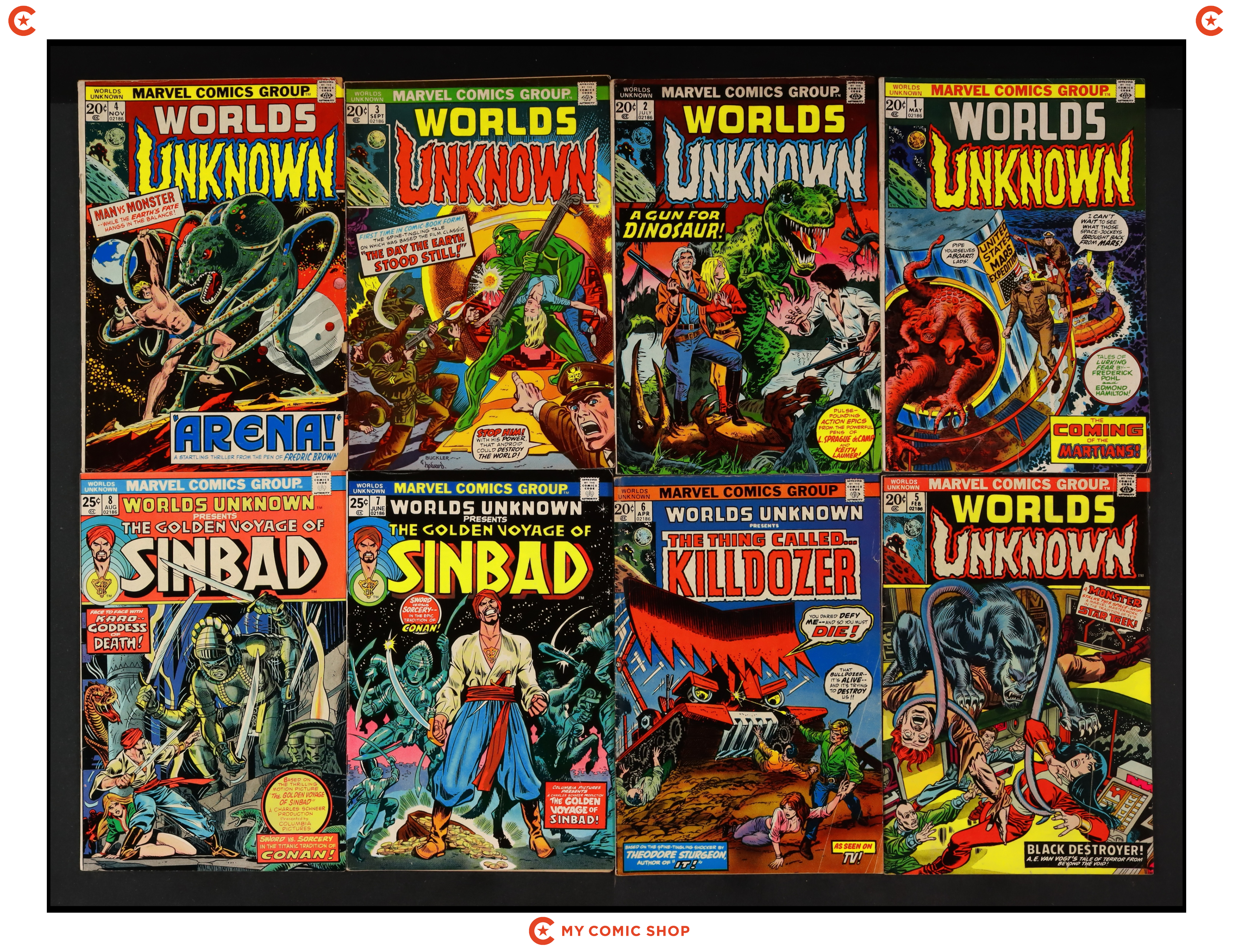 Issues 1-8 of Worlds Unknown (1973 Marvel). Most will grade in the GD/VG to VG/FN range, with 1 grading at FR.
