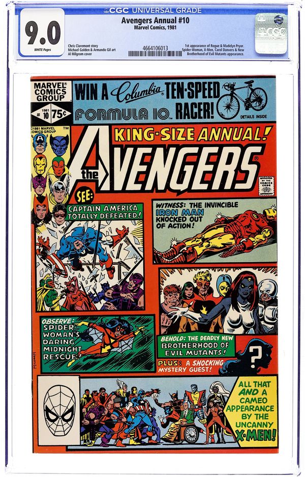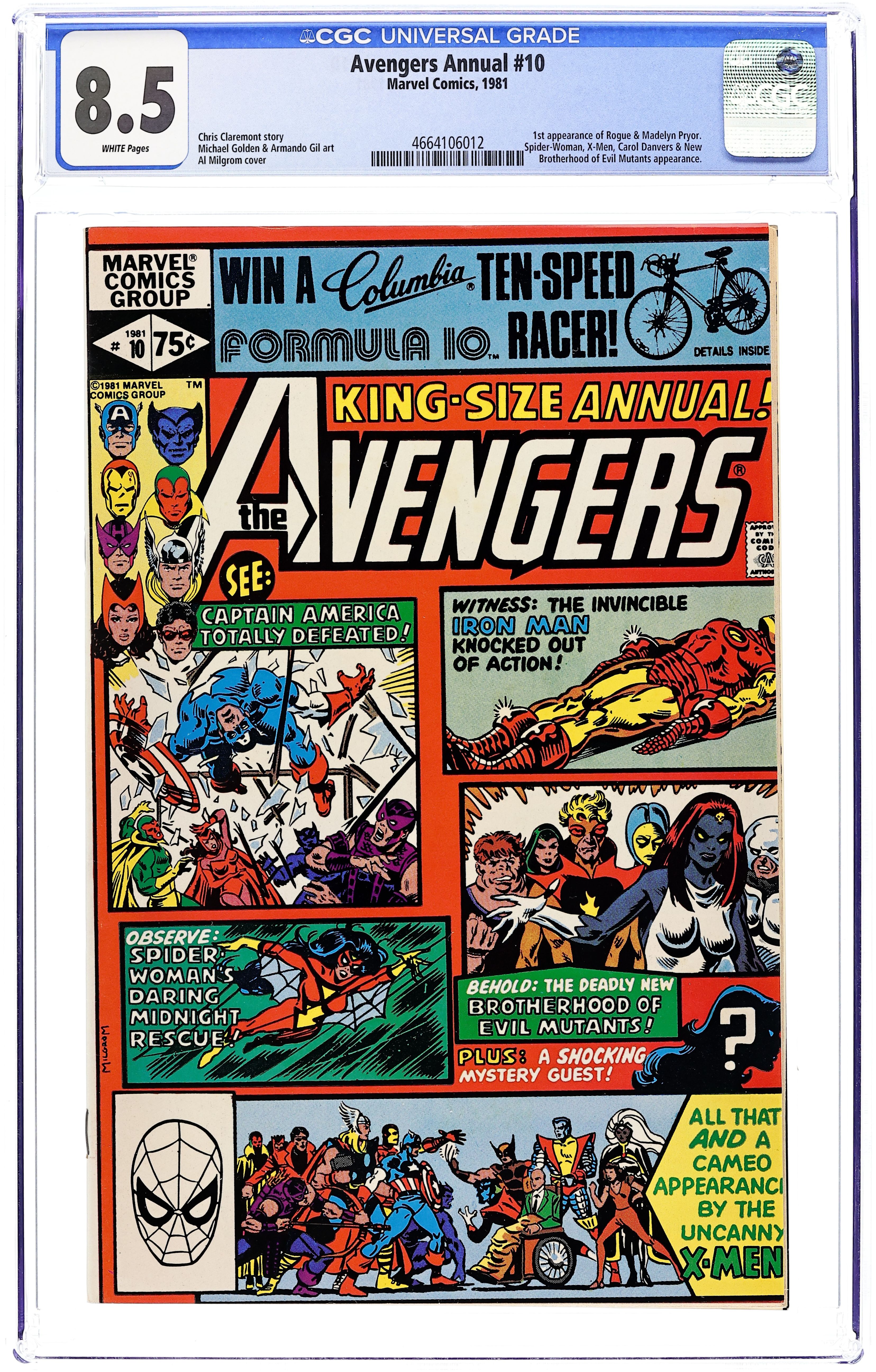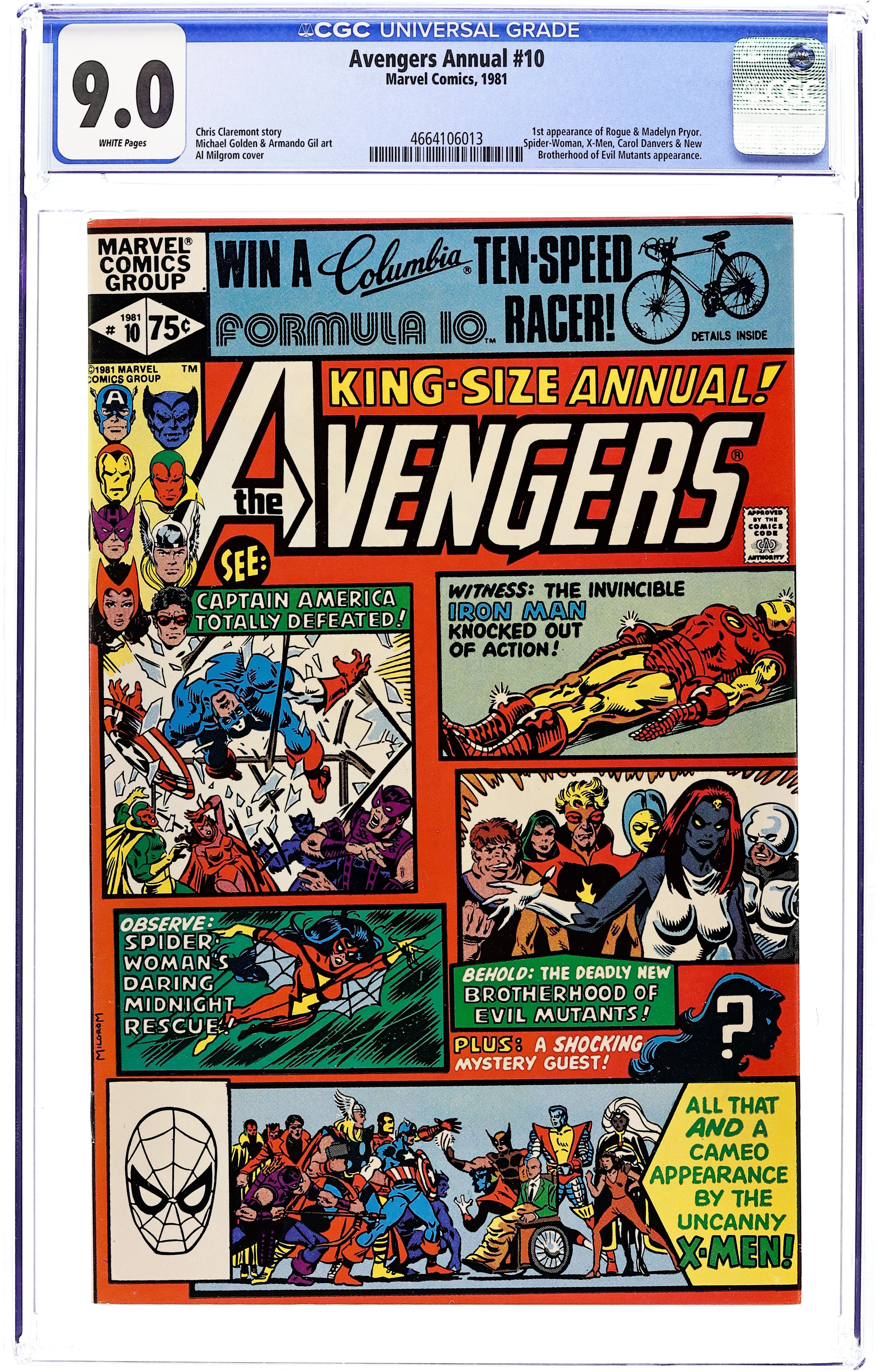Starts Jan 26 Direct Edition. First appearance of Rogue and Madelyne Pryor in "By My Friends Betrayed!" Spider-Woman, X-Men, Carol Danvers, and New Brotherhood of Mutants guest star. Script by Chris Claremont. Pencils by Michael Golden. Inks by Armando Gil. Cover by Al Milgrom. This action-packed annual has got it all, true believers: the first appearance of Rogue, the spectacular art of Michael Golden, the tragic return of Carol Danvers, and the stupendous struggle between the Brotherhood of Evil Mutants and the mighty Avengers! Following the events of Uncanny X-Men #142, Mystique & her New Brotherhood of Evil Mutants attempt to break four of their members out of Ryker's Island prison! After Rogue and Mystique take down Captain America, Iron Man, and Thor, the rest of the Avengers and Spider-Woman catch up to the villains, and the epic clash erupts! Woven in and around the frantic action at Ryker's Island is the heartbreaking story of Carol Danvers' return to Earth. Her life has fallen apart since leaving for Limbo with Marcus Immortus in Avengers #200, and now, stripped of her powers and memories, Carol begins the long road to recovery. And the first step is an emotional confrontation with her former teammates! Notes: Marvel Super-Heroes #11 (Fall 1992) fills in the details of Carol Danvers' life between Avengers #200 and Avengers Annual #10. The Thing stars in a one-page Hostess ad, "A Lesson to Be Learned!" This issue was reprinted in 1993 in the trade paperback: The Greatest Battles of the Avengers. 52 pages, full color. Cover price $0.75.