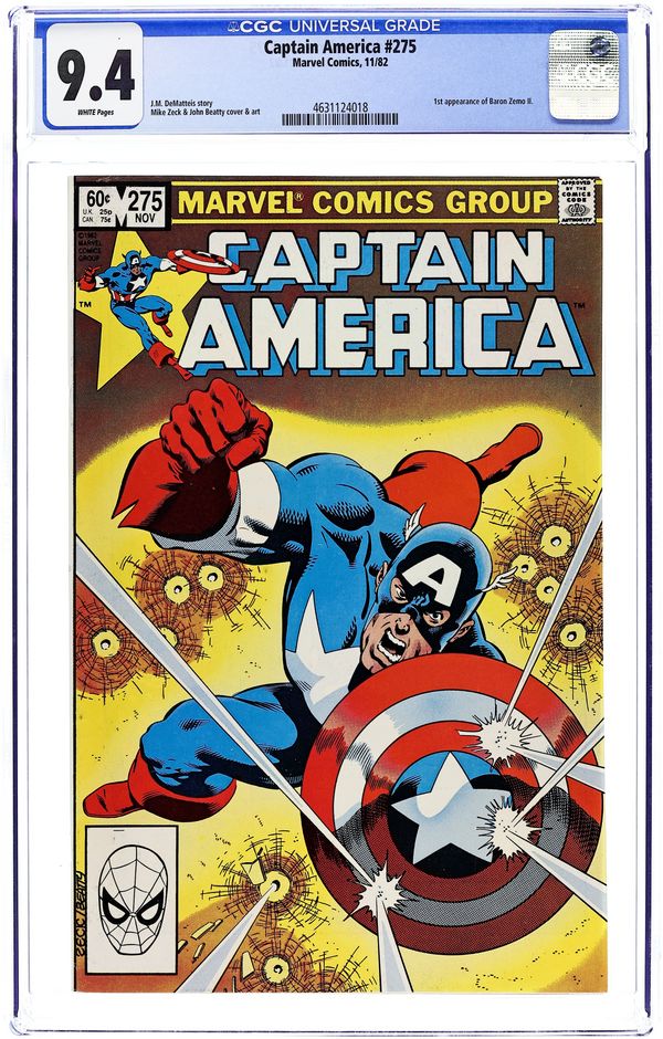 Starts Jan 19 Direct Edition. First (cameo) appearance of Helmut Zemo as Baron Zemo II in "Yesterday's Shadows!" Script by J.M. DeMatteis. Pencils by Mike Zeck. Inks by John Beatty, Joe Rubinstein (uncredited), and Brett Breeding (uncredited). Cover by Mike Zeck and John Beatty. At the request of Bernie Rosenthal, Steve Rogers attends an anti-nazi rally in Long Island. The demonstration proceeds peacefully until a pro-nazi group shows up. Once violence erupts, the star-spangled avenger jumps into the mêlée to restore order! After everyone has calmed down, Captain America speaks to the crowd. And then and there...Bernie realizes that Cap's voice -- sounds just like Steve Rogers' voice. Meanwhile, Vermin escapes from SHIELD custody, and Sam Wilson (aka the Falcon) announces his intentions to run for Congress. Cameo appearances by Arnie Roth, Gail Runciter, Primus (in disguise), Sarah Wilson, and Peter Parker. (Notes: Helmut Zemo first appeared in Captain America 168 under the nom de guerre of the Phoenix. The DeMatteis-Zeck run on the Captain America title hits its stride with issue 275.) 36 pages. Cover price $0.60.