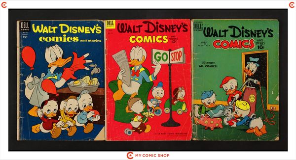 Issues 337, 345, 346, 348, 350, 352A, 353A, 354A, 355A, 358A, and 368 of Walt Disney's Comics and Stories (1940 Dell/Gold Key/Gladstone). Most will grade in the GD to VG range with #345 grading PR(missing page).