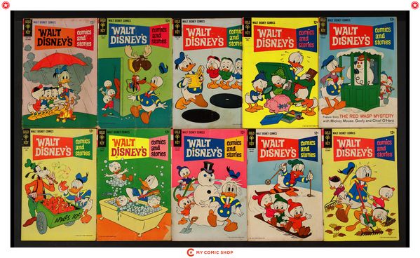 Issues 317, 319, 321, 323, 324, 327, 328, 329, 330, and 333-12C of Walt Disney's Comics and Stories (1940 Dell/Gold Key/Gladstone). Most will grade in the GD to GD/VG range with #317 grading PR (missing centerfold).