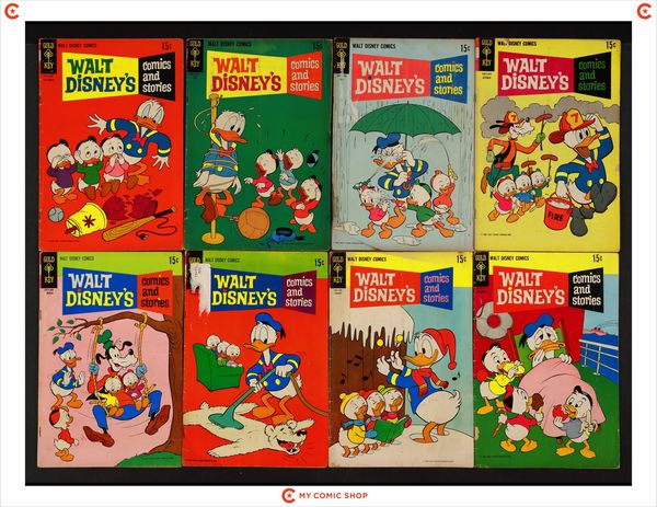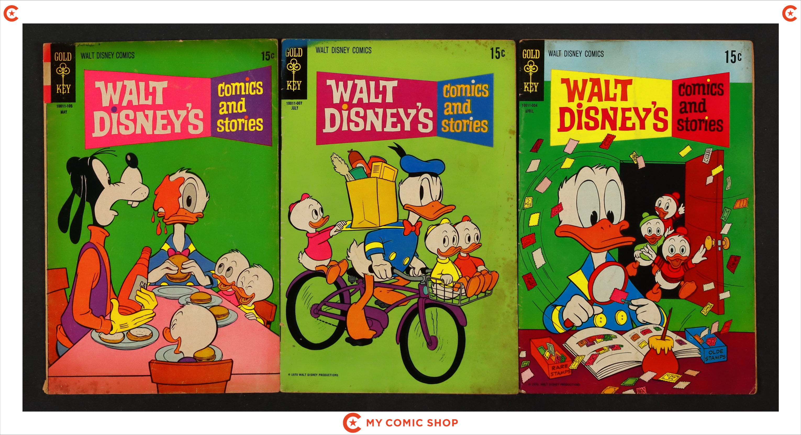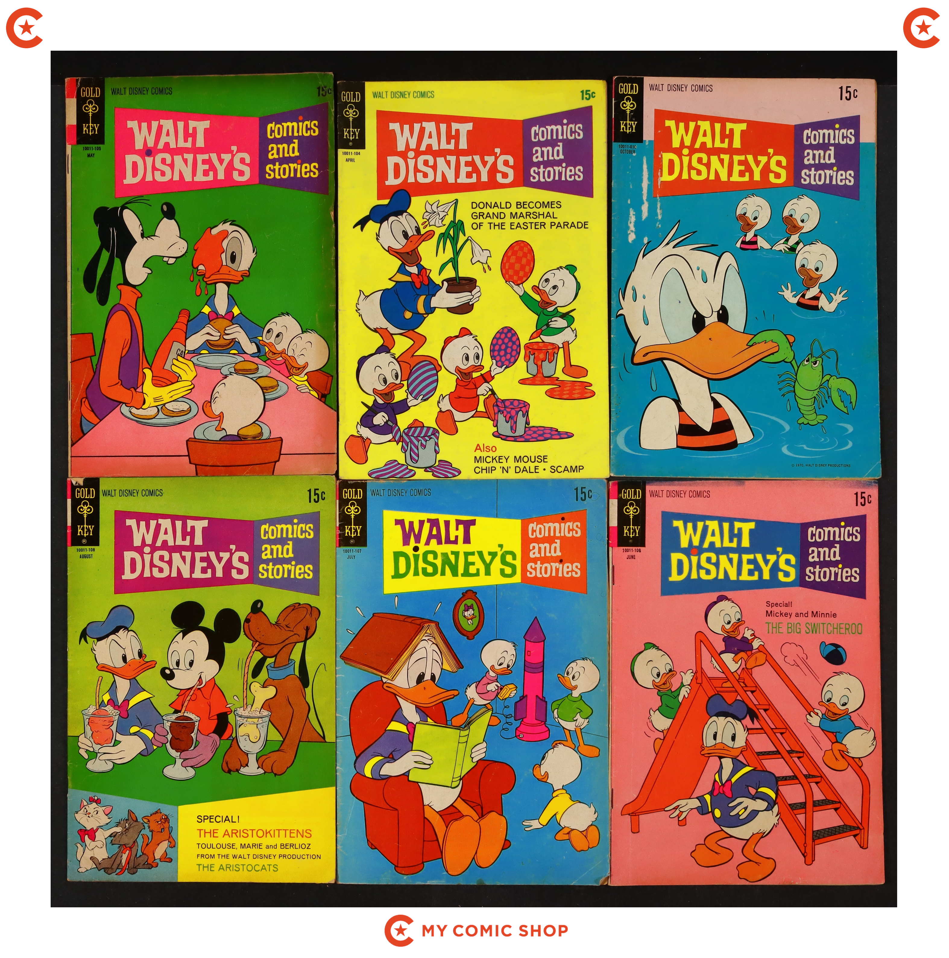 Issues 361, 367, 368, 369, 370, 371, 374, 375, and 376 of Walt Disney's Comics and Stories (1940 Dell/Gold Key/Gladstone). Most will grade in the GD to VG range.