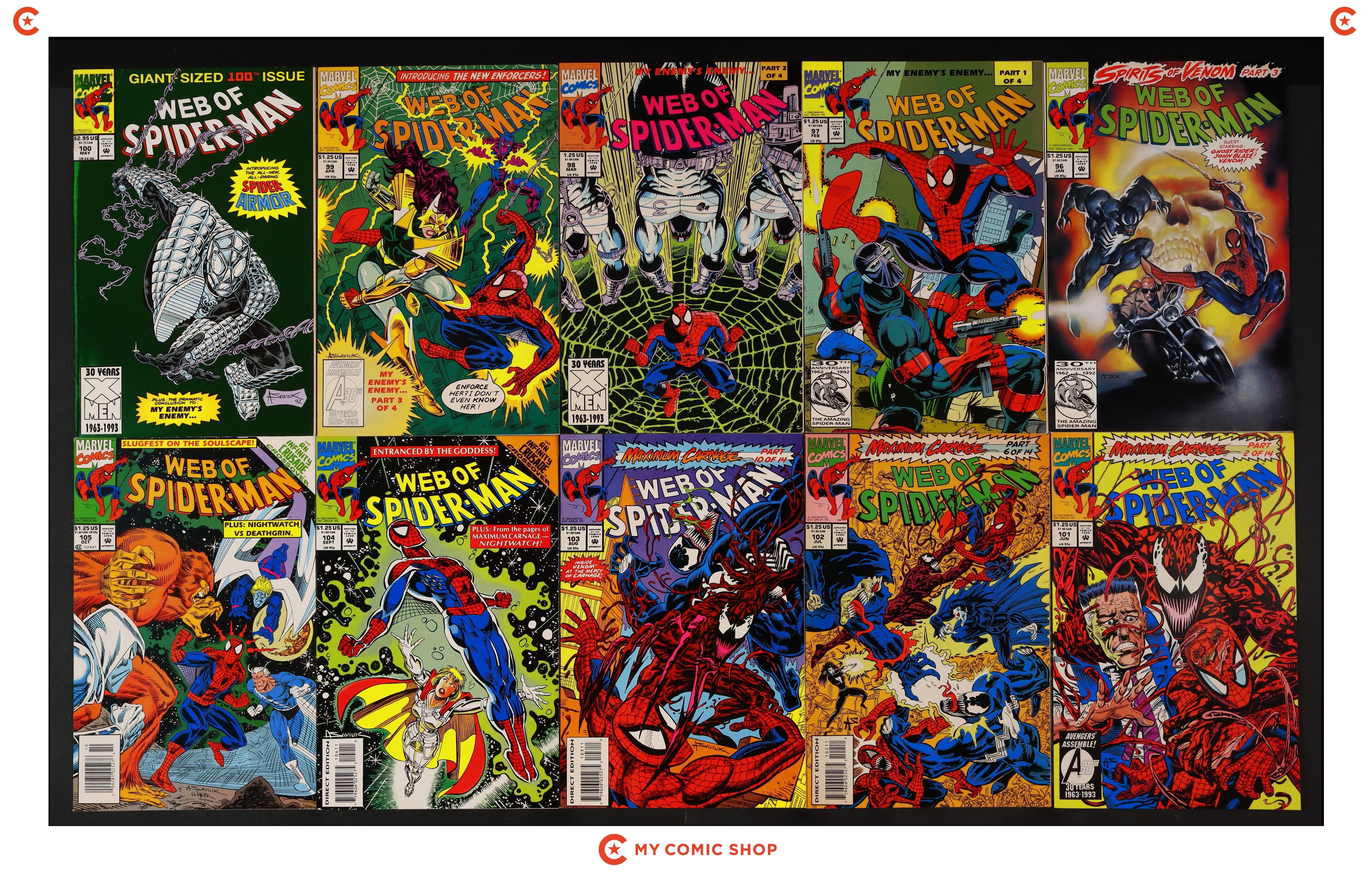 Issues 128N, 129N; and Annuals 1D, 2-7, 8D, 9P (opened) of Web of Spider-Man (1985 1st Series). Most will grade in the FN/VF to VF/NM range.