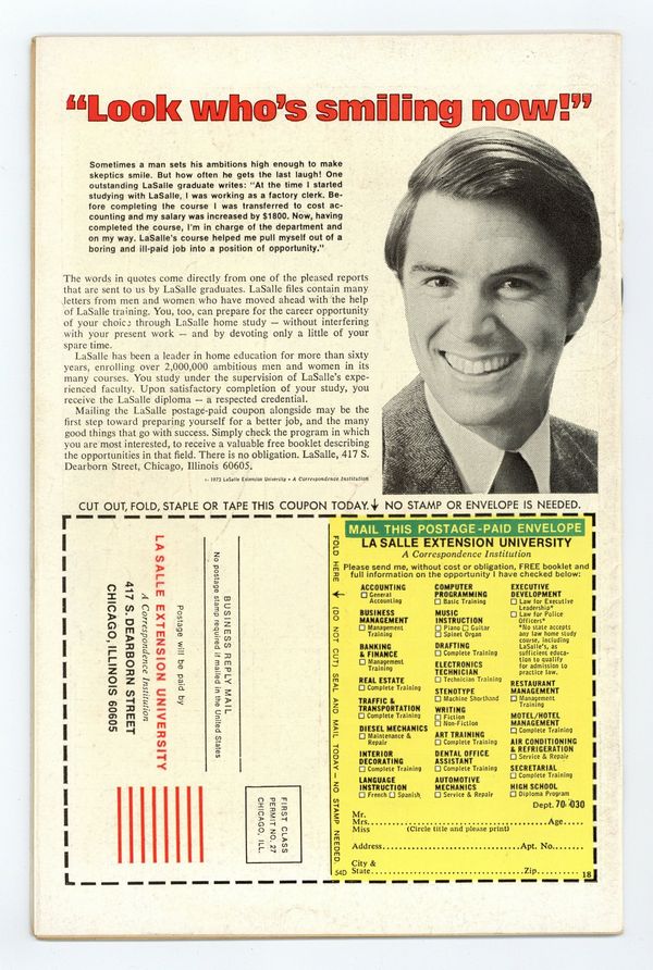 Starts Apr 20 "Whodunit!" Script by Len Wein. Art by Sal Buscema (layouts) and Mike Esposito (finishes). Cover by John Romita. In shocking fashion the co-developer of the Worldwide Habitual Offender database is found murdered in his research lab! And the task of finding the killer falls to none other than your friendly neighborhood Spider-Man! The web-slinger scours the city searching for suspects! But the trail of clues leads back to the lab! Who is the killer? Who indeed! Cameo appearances by Joe Robertson and J. Jonah Jameson. (Notes: The letters page includes a statement of ownership: average print run 530,714; average paid circulation 273,773. This story was reprinted in Marvel Tales 132. A 30-cent cover price variant exists for this issue.) 36 pages. Cover price $0.25.