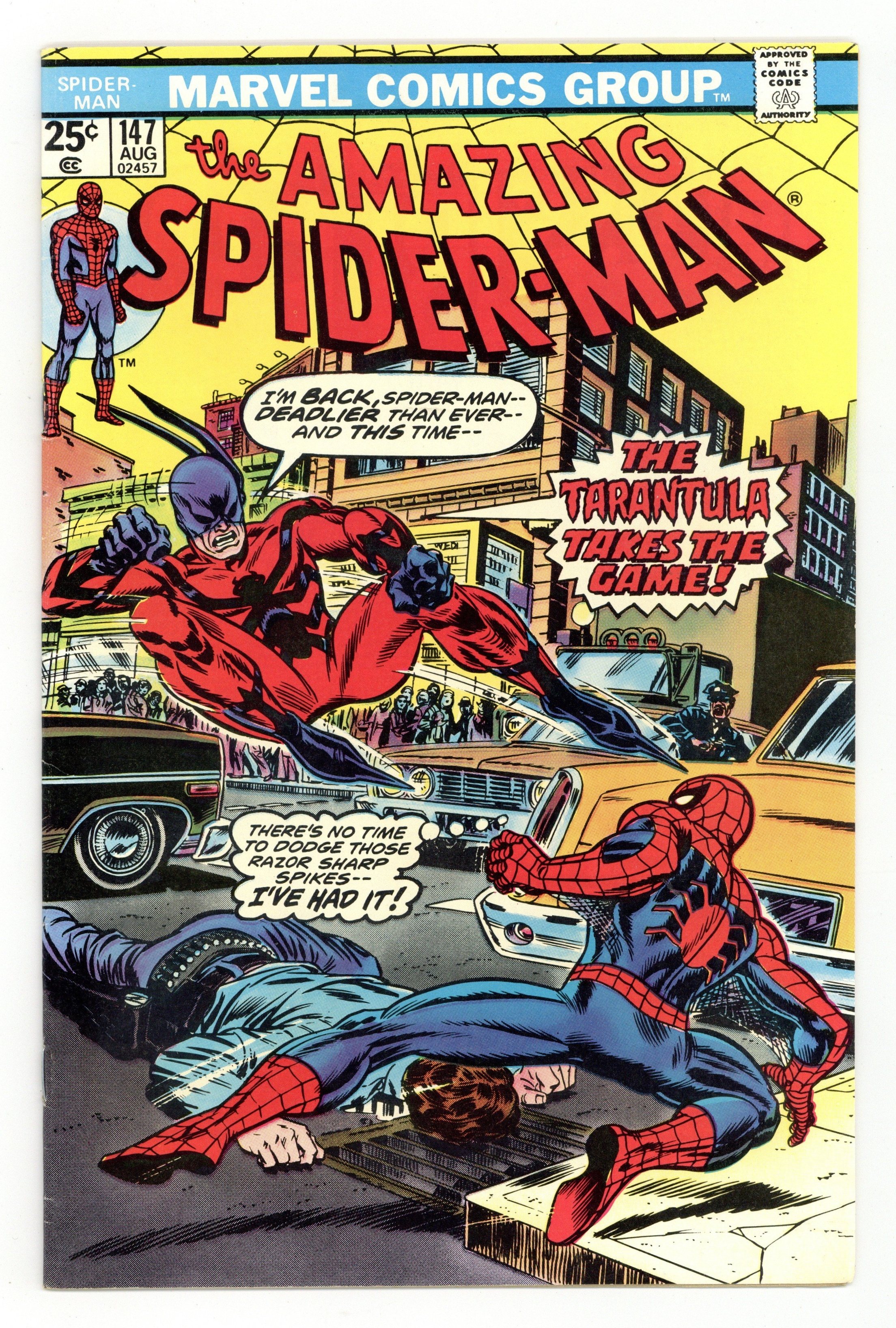 Starts May 25 "The Tarantula is a Very Deadly Beast!" Script by Gerry Conway. Pencils by Ross Andru. Inks by Mike Esposito and Dave Hunt (backgrounds). Cover by John Romita Sr. Following his adventure in the Everglades (in Giant-Size Spider-Man 5), the wondrous wall-crawler returns to New York City! However everything is just as chaotic as when he left, thanks to the Gwen Stacy clone...and the Tarantula! The South American super-villain ambushes the spectacular one on the streets of Manhattan! And after a short skirmish, the Tarantula throws the web-slinger into a city bus! But this is no ordinary bus! For the driver is the Jackal...and the only passenger is Gwen Stacy! As for the bus' destination? Try the Brooklyn Bridge! Oh no, are the sins of the past coming back to haunt your friendly neighborhood Spider-Man? Cameo appearances by Mary Jane Watson, Ned Leeds, Aunt May, Anna Watson, and J. Jonah Jameson. Flashback cameo by Ben Parker. (Note: The Tarantula previously appeared in Amazing Spider-Man 135. The letters page includes Marvel Value Stamp series A #42 Man-Wolf by Gil Kane and Mike Esposito. This story was reprinted in Marvel Tales 124.) 36 pages. 25c cover price. Cover price $0.25.