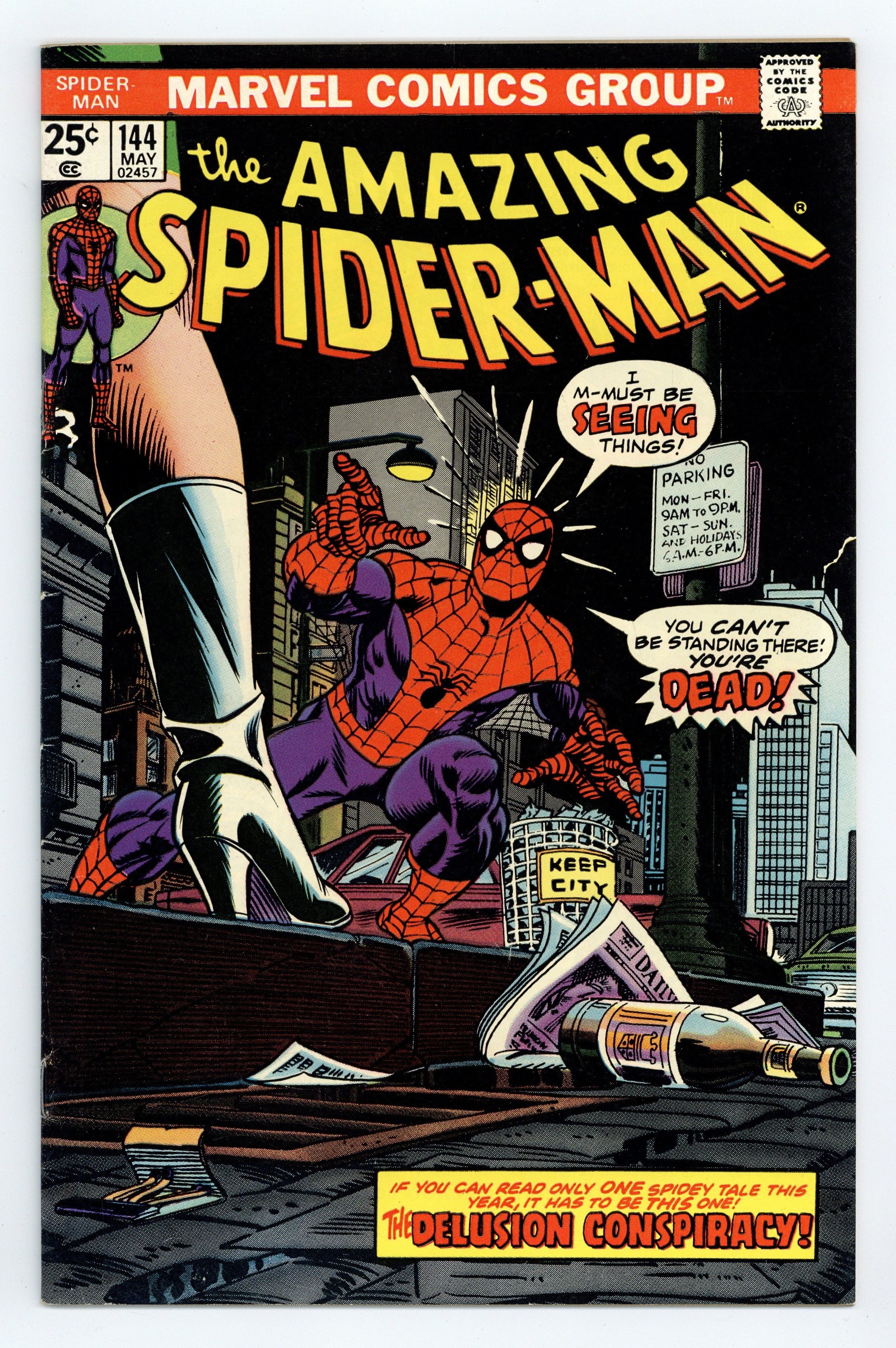 Starts Apr 20 "Dead Man's Bluff" Part 2 of 2. Script by Gerry Conway. Art by Ross Andru (breakdowns), Frank Giacoia (finishes), and Dave Hunt (backgrounds). Cover by John Romita. An angry wall-crawler scours Manhattan looking for Mysterio! The web-slinger's long-time foe has made the grave mistake of using the late Gwen Stacy as one of his illusions! And that's stepping way over the line! But what if Peter's sighting of Gwen was genuine? Hold on, that's impossible! Gwen died several months ago! Or did she? Your friendly neighborhood Spider-Man will dive into that mystery soon enough! But in the meantime, he's giving a piece of his mind to Mysterio! First (cameo) appearance of the Gwen Stacy clone. Cameo appearances by Mary Jane Watson, Aunt May, Glory Grant, Betty Brant, Ned Leeds, Joe Robertson, and J. Jonah Jameson. (Note: This story was reprinted in Marvel Tales 119.) 36 pages. 25c cover price. Cover price $0.25.