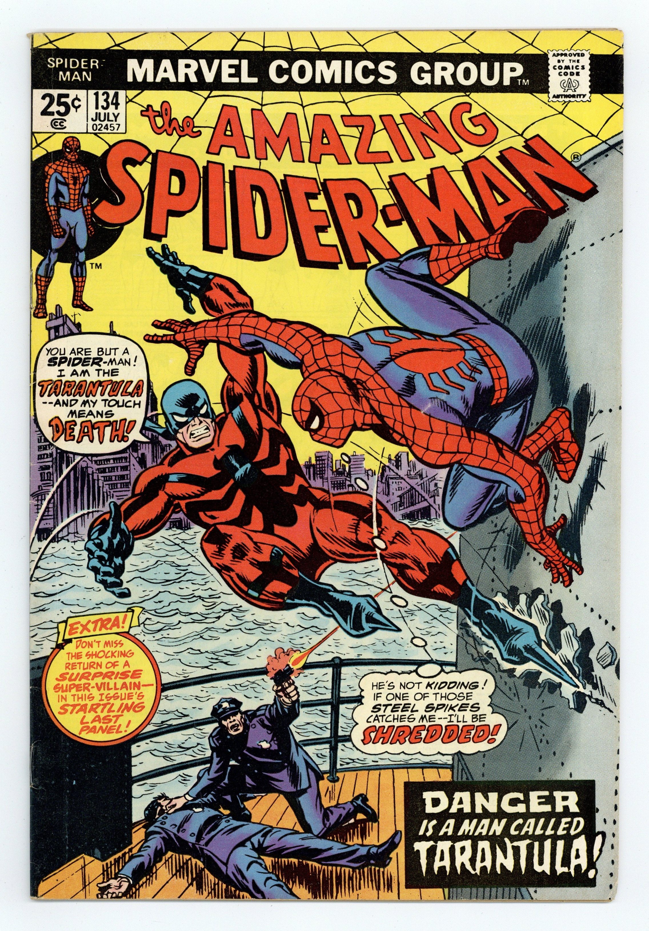 Starts May 11 Second (full) appearance of the Punisher in "Shoot-Out in Central Park!" Part 2 of 2. Guest-starring the Punisher. Script by Gerry Conway. Pencils by Ross Andru. Inks by Frank Giacoia. Cover by John Romita. Out of the blue, the Punisher appears on the deck of the day-liner...with the Amazing Spider-Man dead in his sights! Oh no! Does Frank Castle know the Tarantula is the actual bad guy onboard? After a brief scuffle, the web-slinger and the Punisher agree to work together; but the Tarantula has already jumped ship. Several hours later in Central Park, the wall-crawling hero and the gun-toting anti-hero join forces...to tame the Tarantula! In the meantime, Harry Osborn discovers a spider-suit in Peter Parker's dresser. And big trouble is ahead next issue! Origin of the Tarantula. Cameo appearances by Mary Jane Watson, Flash Thompson, Liz Allan, J. Jonah Jameson, and Joe Robertson. (Notes: The Punisher returns in Giant-Size Spider-Man #4. The letters page includes a letter from comics editor Steve Saffel. The letters page also includes Marvel Value Stamp series A #4 Thing (of the FF) by John Buscema and Joe Sinnott. This issue was reprinted in Marvel Tales 112 and again in issue 211.) 32 pages. Cover price $0.25.