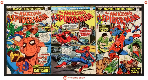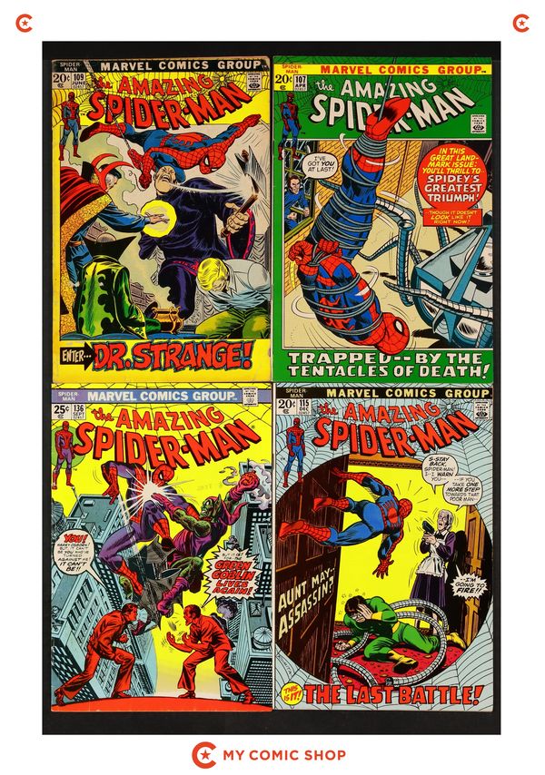 Issues 107, 109, 115, 136, 140, 147, and 150 of Amazing Spider-Man (1963 1st Series). Most will grade in the FN to VG range.