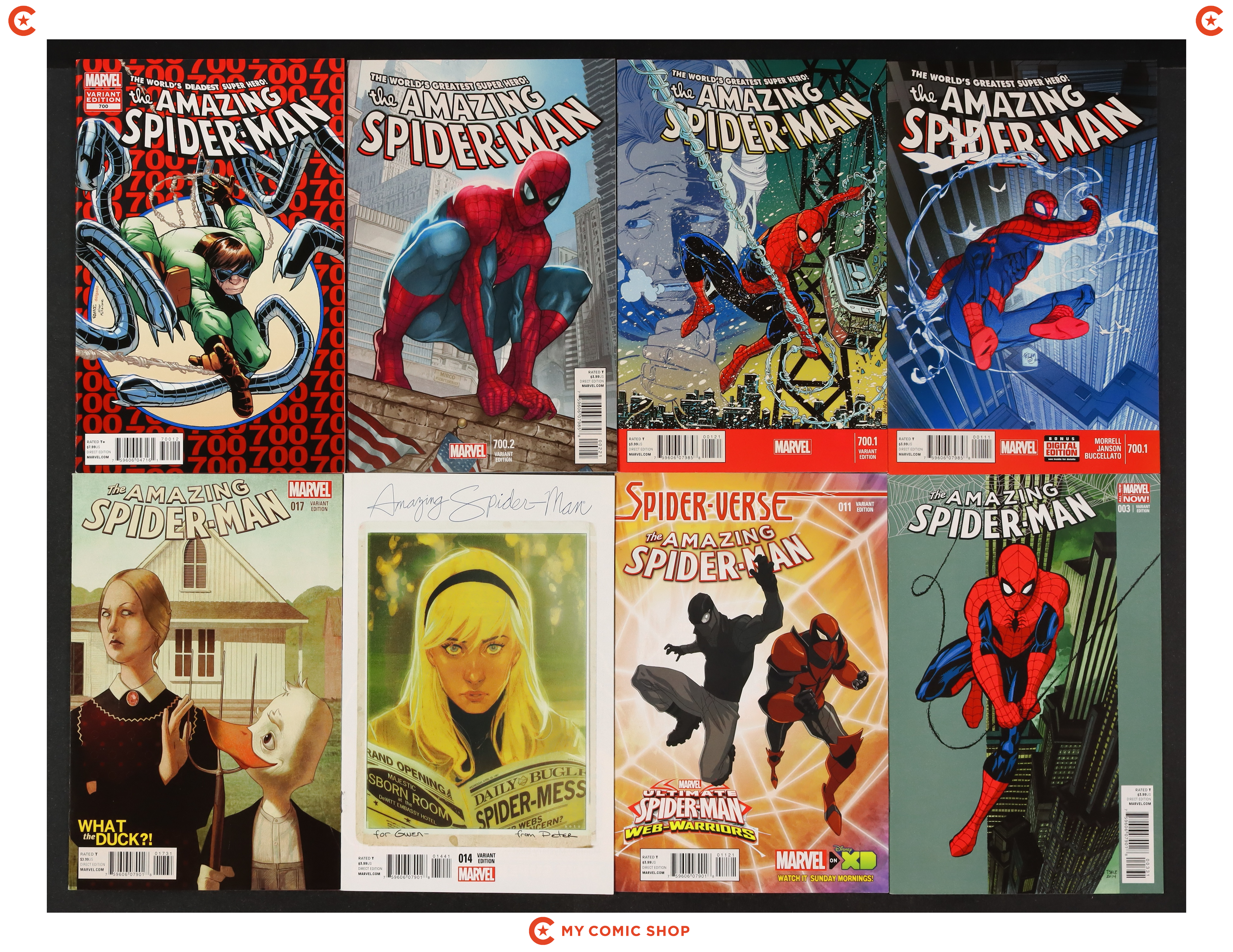 Issues 700.1A, 700.1B, 700.2B, and 700I of Amazing Spider-Man (1998 2nd Series); and 3B, 11C, 14C, and 17C of Amazing Spider-Man (2014 3rd Series). Most will grade in the VF range with a couple grading FN.