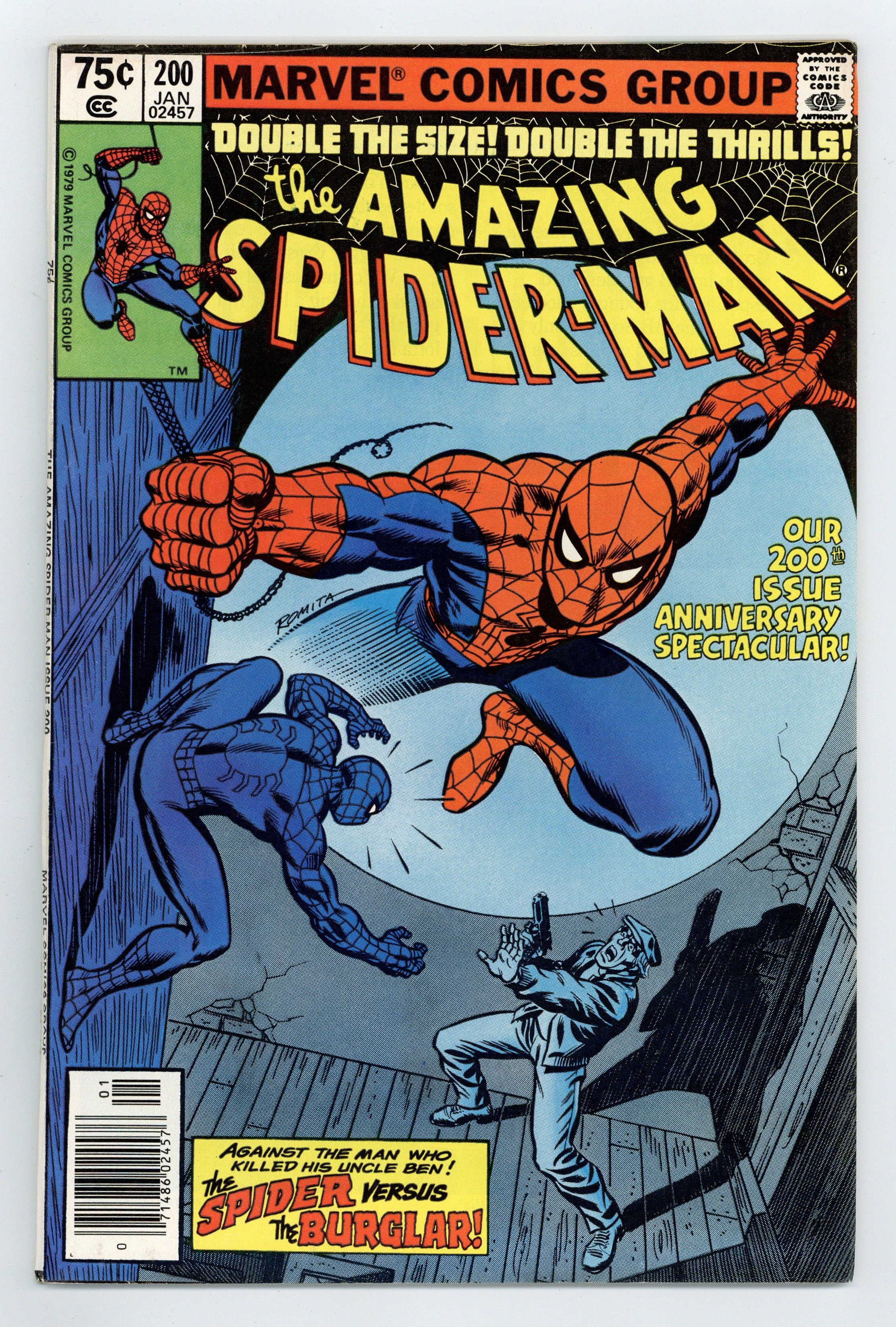 Starts May 18 Newsstand Edition. "The Spider and the Burglar...A Sequel" Script by Marv Wolfman. Art by Keith Pollard (breakdowns) and Jim Mooney (finishes). Cover by John Romita. It's the bicentennial issue of the Amazing Spider-Man! And the web-slinger is going back, all the way back, to the days of Amazing Fantasy 15 to once again confront the criminal that murdered his Uncle Ben! But this time Peter Parker will have to stop the killer without his spider powers! Given a second chance, can the wall-crawler right the wrongs from the past and save his beloved Aunt May? Emotions run at an all-time high for your friendly neighborhood Spider-Man! Brief retelling of Spider-Man's origin. Cameo appearance by Anna Watson. Final appearance of the burglar. Flashback cameo by Ben Parker. (Note: Stan Lee scripts the final page of the story.) 52 pgs. Cover price $0.75.