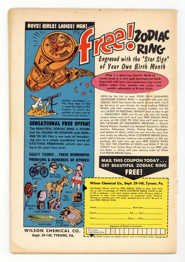 Starts May 25 Cover art by Orlando Busino. Centerfold has a cut out Werewolf mask. Only 10-cent issue. Humorous monster stories: Hugo the Werewolf; Hugo is granted his wish to be turned human, but hates it. Ads For Monsters. Movie Monsters. Travel to Transylvania. The Ogre's Ode starring Red Martian Man, Invisible Man, Phantom of the Opera, Wolfman, and Wombat Man. Tut-Tut the Mummy. Scripts by George Gladir, art by Orlando Busino. 36 pgs. $0.10. Cover price $0.10.