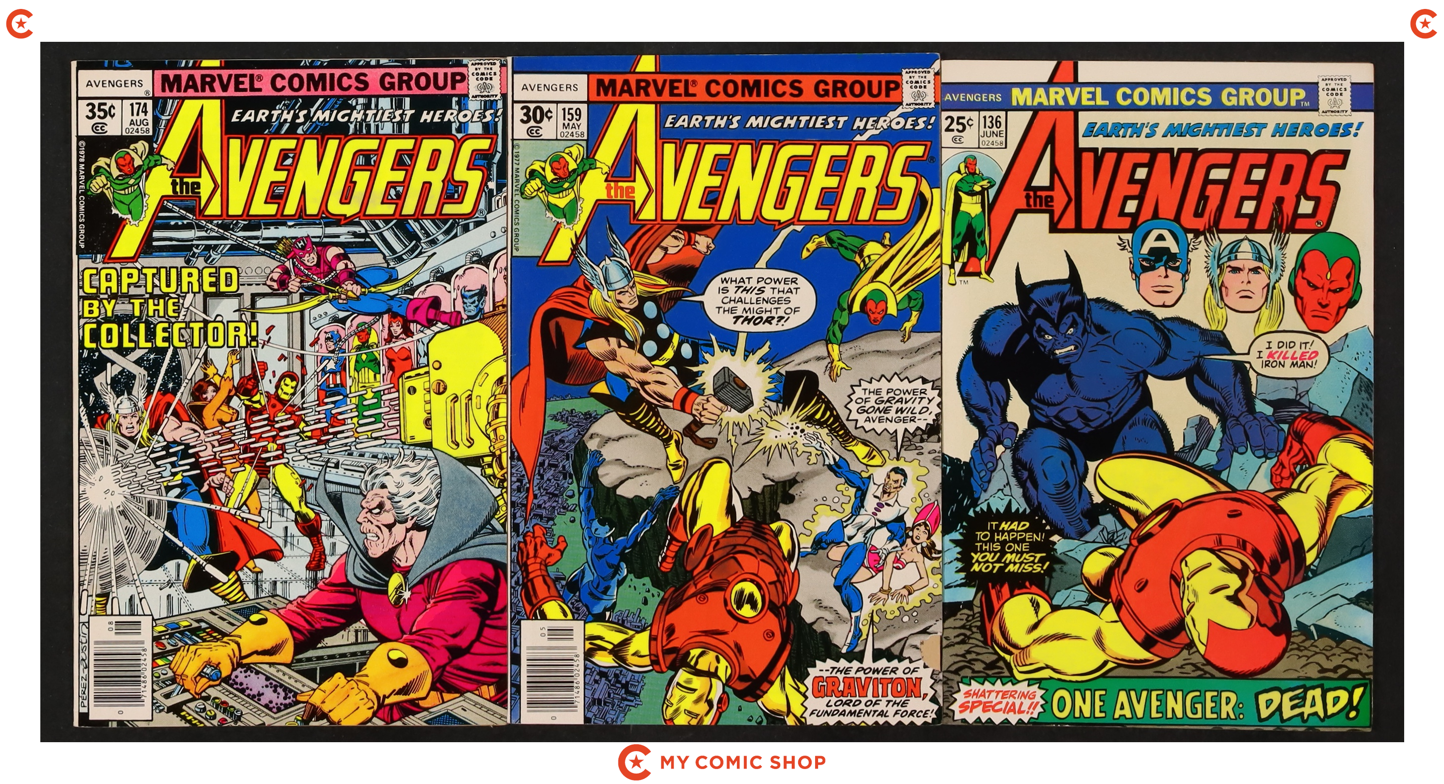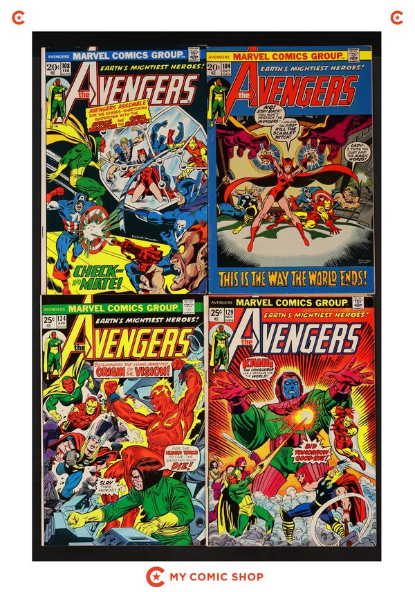Issues 160, 164, 165, 167, 168, 170, 172, 173, 179, 182, 183, 184N, and 197 of Avengers (1963 1st Series). Most will grade in the VF- to FN range with a couple grading VG.