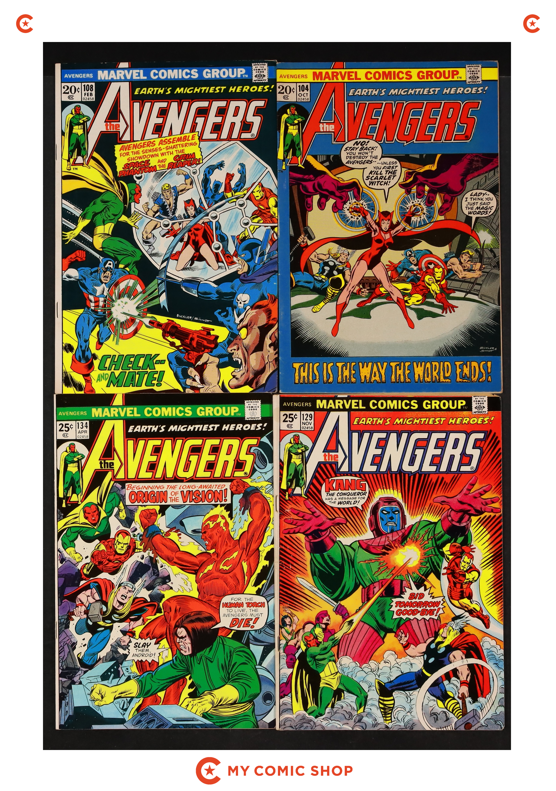 Mark Jeweler Advertisement Insert Variant. The Avengers battle Kang, the Frankenstein Monster, Wonder Man, Baron Zemo, and the Golden Age Human Torch in "A Quiet Half-Hour in Saigon!" Script by Steve Englehart, breakdowns by Sal Buscema, inks by Joe Staton. Avengers roll call: Thor, Iron Man, Mantis, Hawkeye, and the Vision. Letter to the editor from artist Ken Meyer Jr. The letters page also contains Marvel Value Stamp series A # 70 (Super Skrull by Jack Kirby, the same one that's in issue 128). Gil Kane/Frank Giacoia cover. Cover price $0.25.