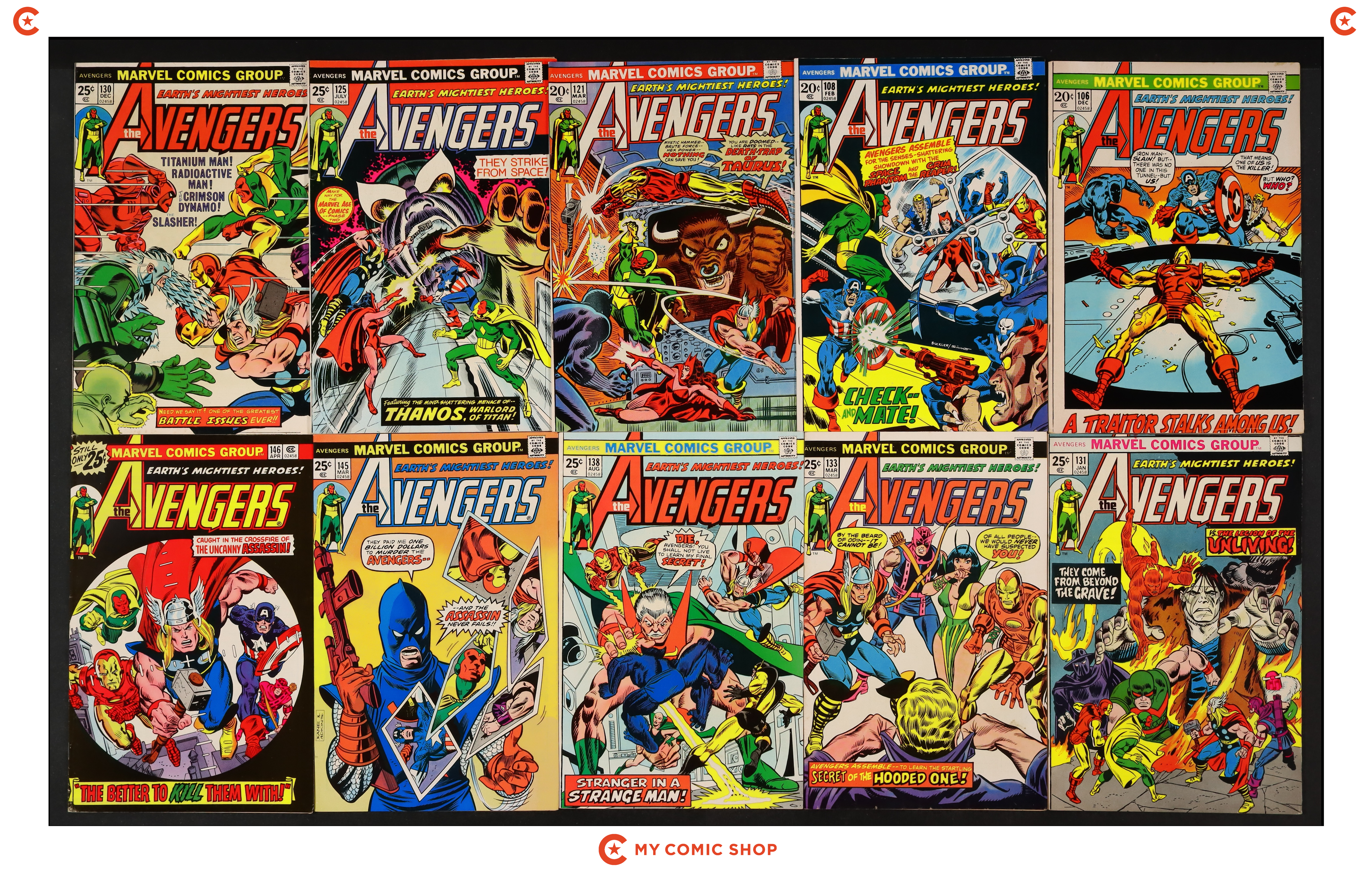 Issues 106, 108, 121, 125, 130, 131, 133, 138, 145, and 146 of Avengers (1963 1st Series). Most will grade in the FN range with a couple grading VG and #125 grading FR (missing Marvel Value Stamp).