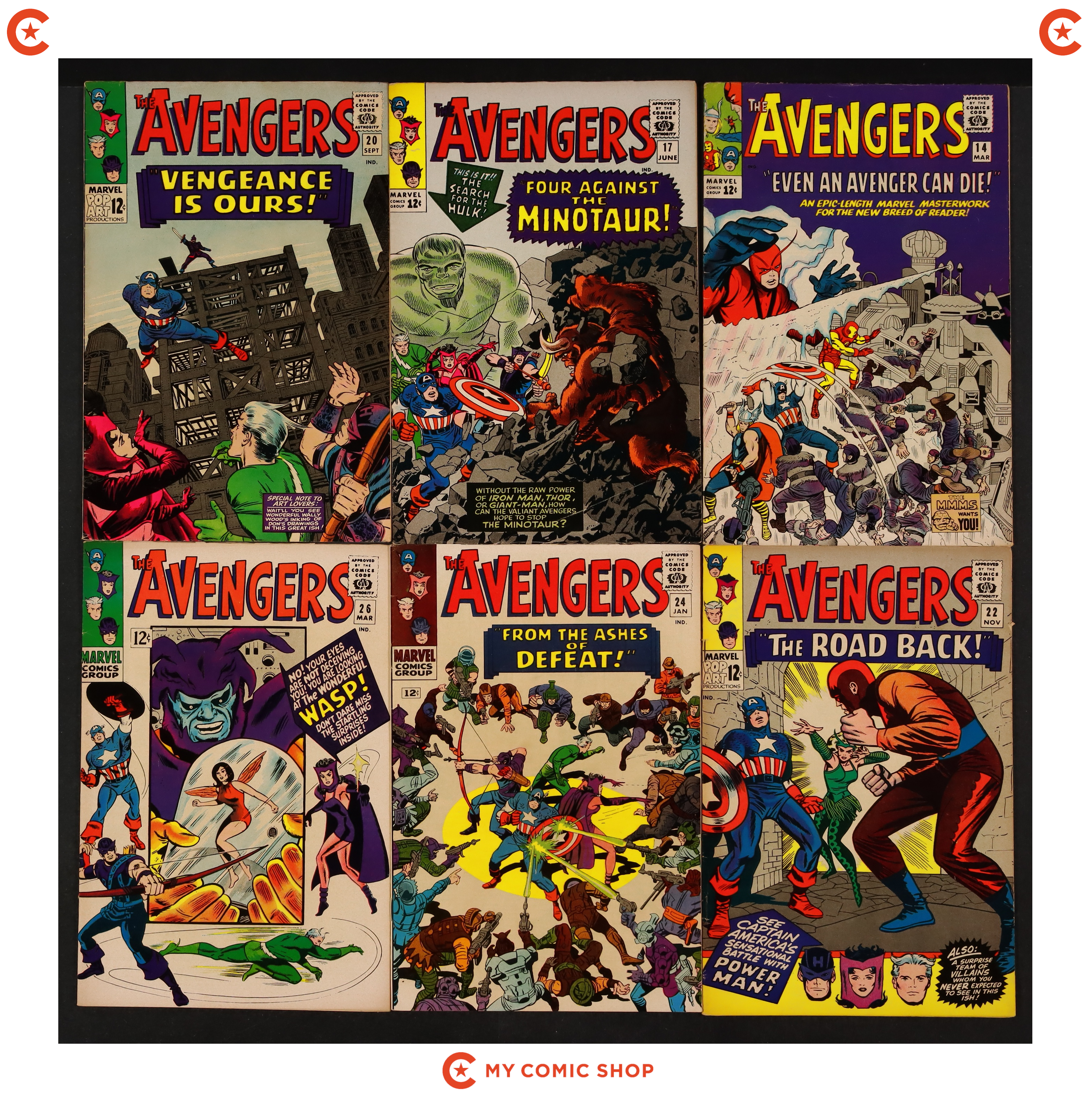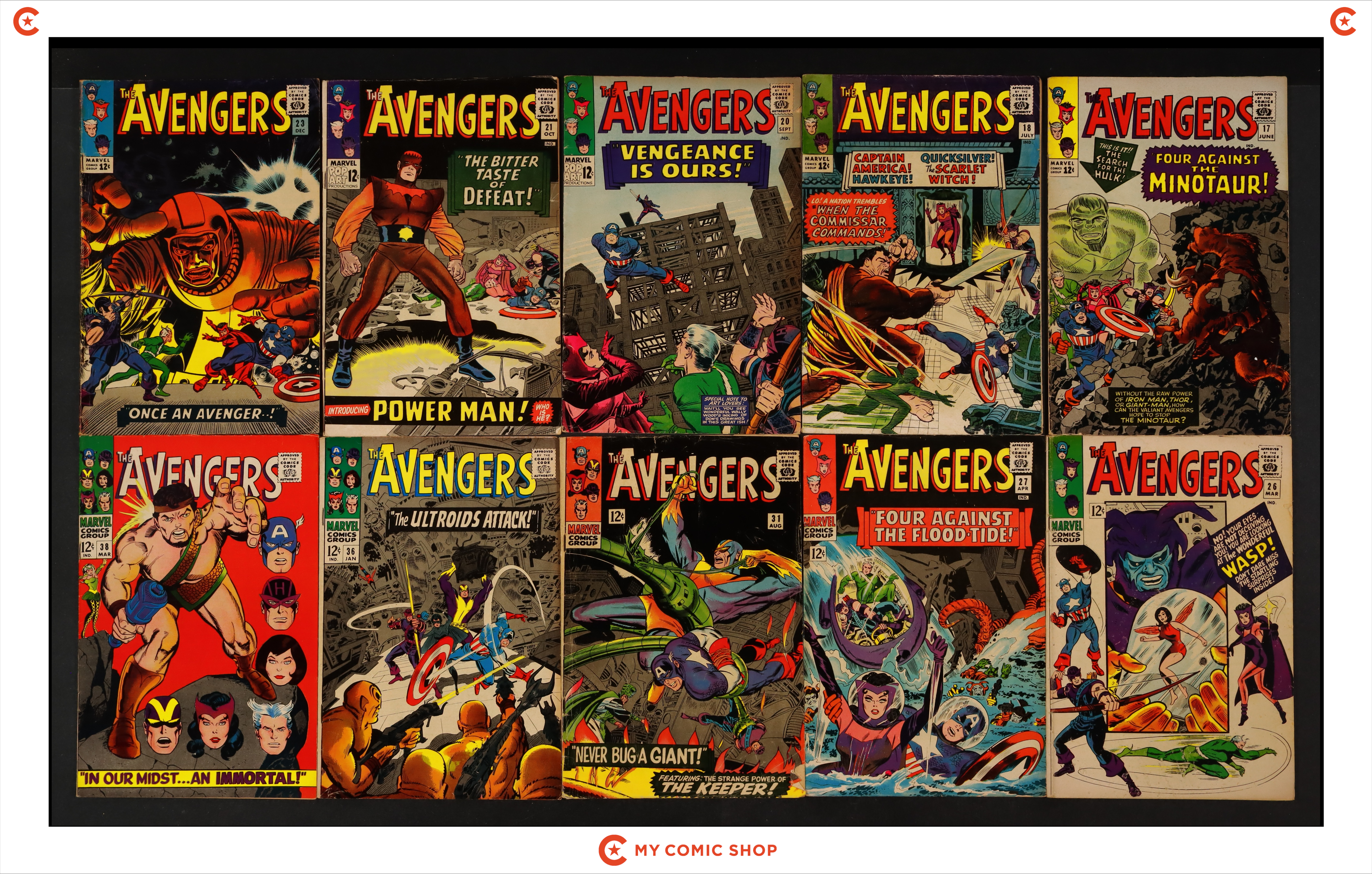 Issues 17, 18, 20, 21, 23, 26, 27, 31, 36, and 38 of Avengers (1963 1st Series). Most will grade in the VG to GD range.