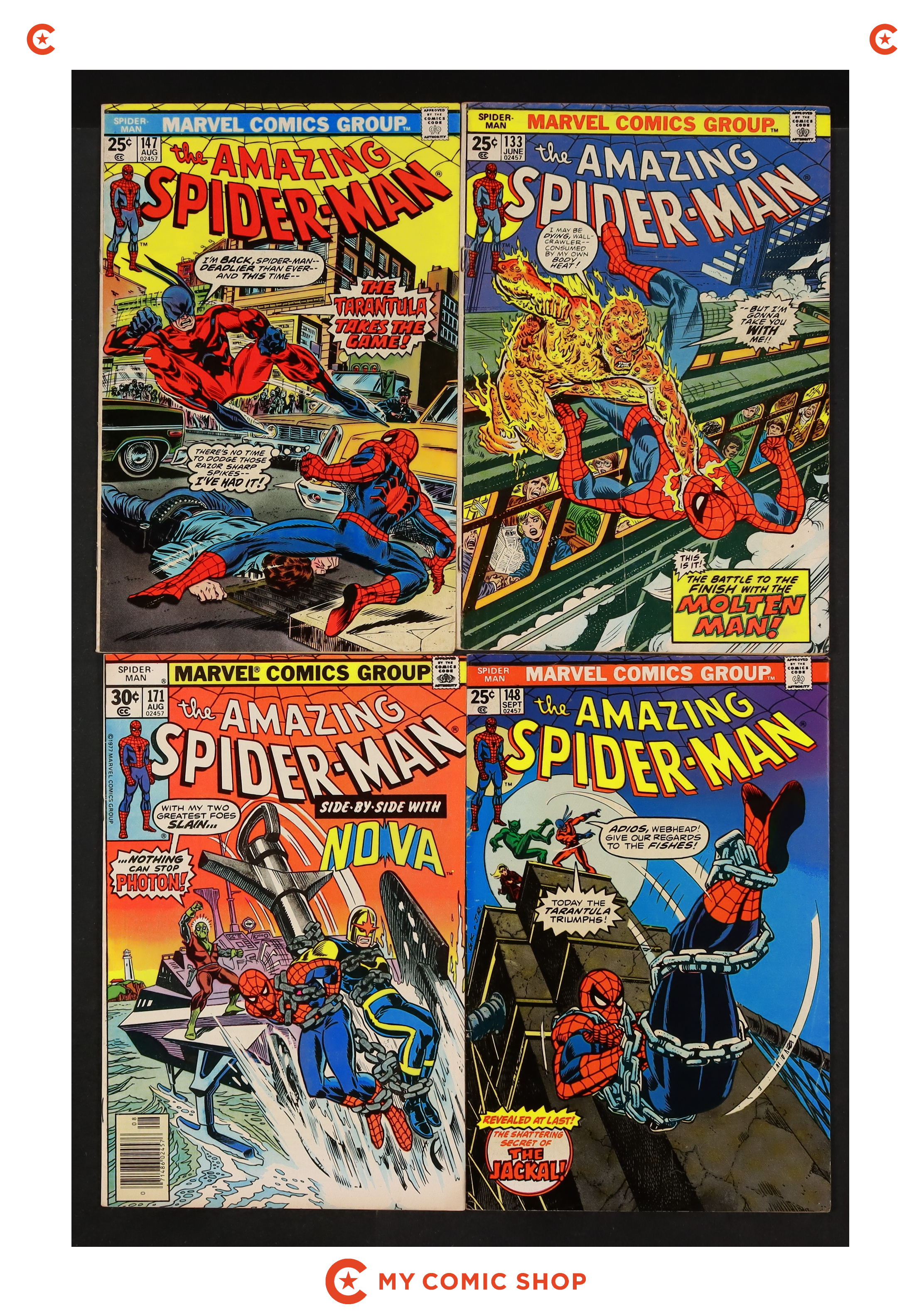 Issues 133, 147, 148, 171 of Amazing Spider-Man (1963 1st Series). Most will grade in the VG- to FN range.