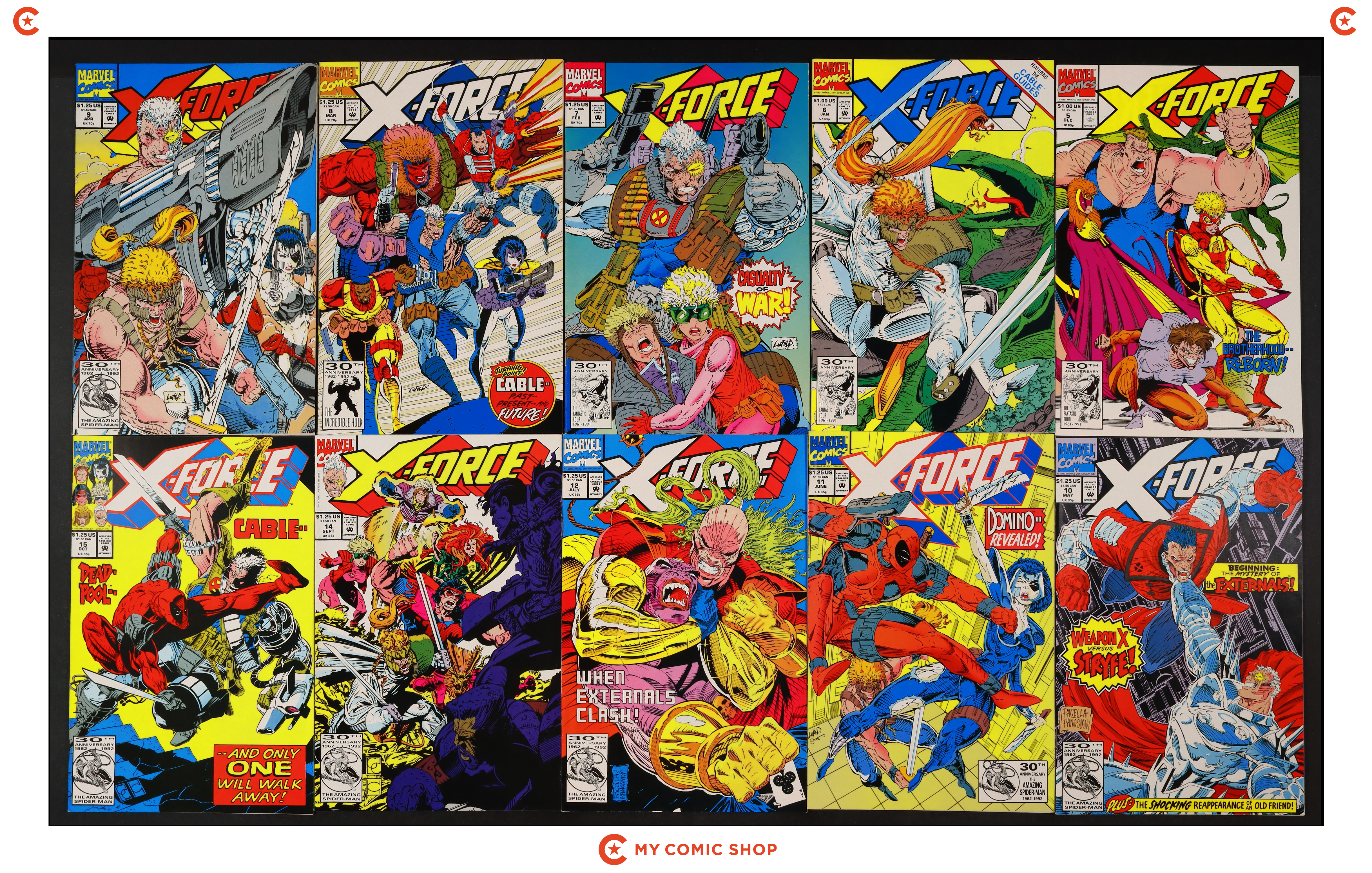 Issues 5, 6D, 7D, 8D, 9, 10, 11D, 12, 14, 15 of X-Force (1991 1st Series). Most will grade in the FN to VF/NM range.
