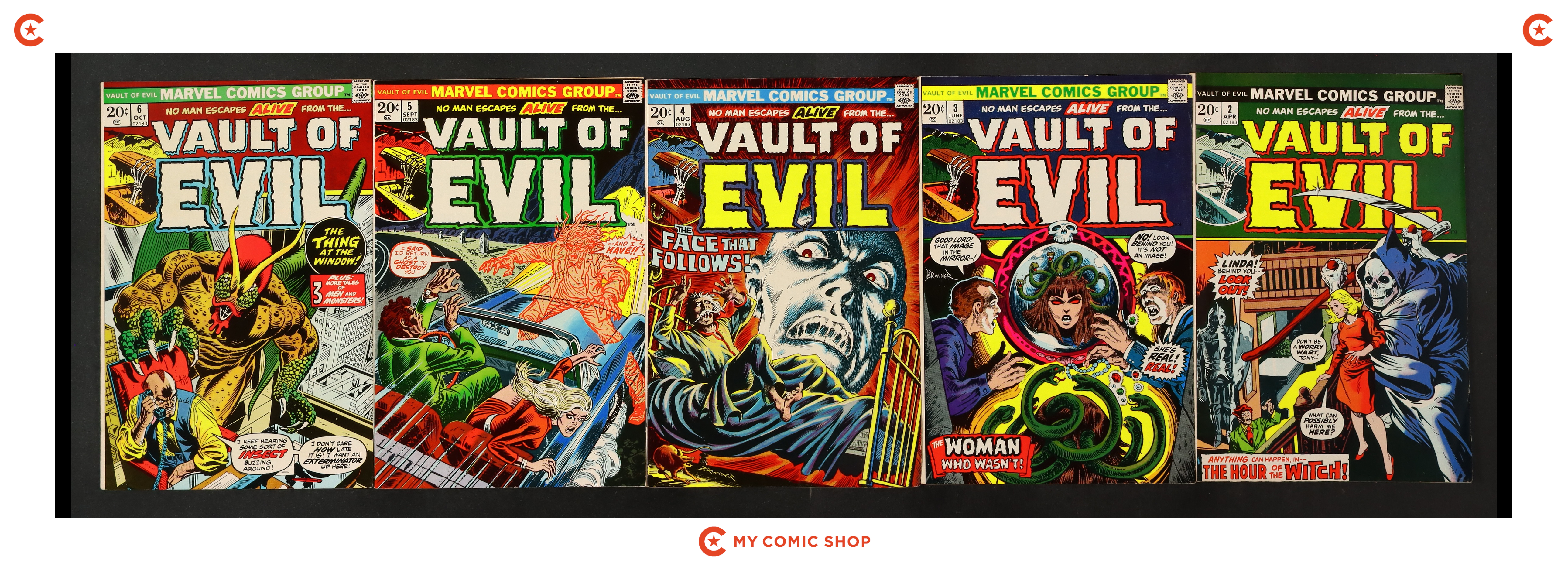 Issues 2-6 of Vault of Evil (1973-1975 Marvel). Most will grade in the VG to FN range.