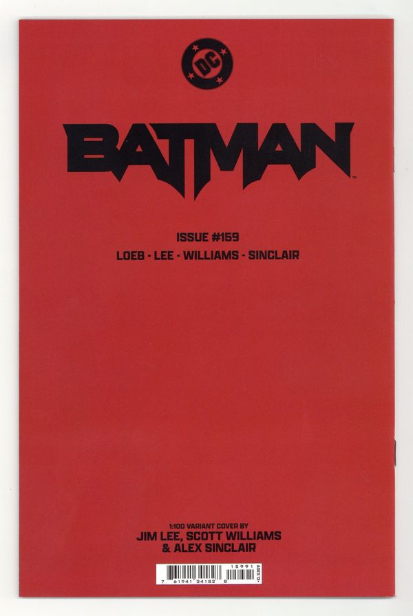 Starts Mar 2 Limited 1 for 100 Retailer Incentive Variant Cover. Written by Jeph Loeb. Art by Jim Lee, Scott Williams. Cover by Jim Lee. H2SH WITH JEPH LOEB AND JIM LEE CONTINUES! After the shocking events of the last issue, Batman must make the hardest decision of his life! Guest-starring Nightwing, Batgirl, and Red Hood! 40 pages, full color. Rated T+ Cover price $5.99.