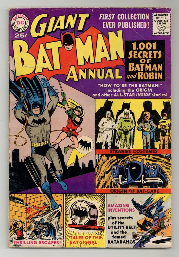 Starts Feb 23 All reprints. Cover pencils by Curt Swan, Sheldon Moldoff, and Dick Sprang, inks by Charles Paris. "How to Be the Batman!", pencils by Lew Sayre Schwartz, inks by Charles Paris; Batman loses his memory after being exposed to amnesia gas, when the antidote fails, Robin must teach the Cowled Crimefighter all that he has forgotten; Origin retold. "The Strange Costumes of Batman!", script by Edmond Hamilton, pencils by Dick Sprang, inks by Charles Paris; A look at some of the specialized costumes that Batman has utilized over his career, including one garment that he had hoped never to use. "Untold Tales of the Bat-Signal!", script by David Vern, pencils by Lew Sayre Schwartz, inks by Charles Paris; Reporter Dave Purdy saves Batman by dazzling an approaching murderer with the Bat Signal; The Masked Manhunter is happy to let Purdy have the credit. Secrets of Batman's Utility Belt; Famed Batarang. "The Origin of the Bat-Cave!", script by Bill Finger, pencils by Sheldon Moldoff, inks by Charles Paris; Professor Nicholls sends the Dynamic Duo back in time 300 years, there they meet Jeremy Coe, a frontiersman spy who doubles as a Red Indian. "Batman's Electronic Crime-File!", pencils by Dick Sprang, inks by Charles Paris; The microfilm from Batman's crime file is stolen from the Bat-Cave. "Thrilling Escapes of Batman and Robin!", pencils by Sheldon Moldoff, inks by Charles Paris; Villainous Paul King captures Batman and Robin, he then sets about devising an inescapable trap, based on Robin's recollections about their previous ingenious escapes. "The Amazing Inventions of Batman," script by Edmond Hamilton, pencils by Dick Sprang, inks by Charles Paris; Batman gets word that one of his inventions is to be used against him, he and Robin must then examine their many crime fighting innovations for clues. Superman ad. Secret Origins ad. Batman with Robin the Boy Wonder ad. 84 pgs., full color. Cover price $0.25.