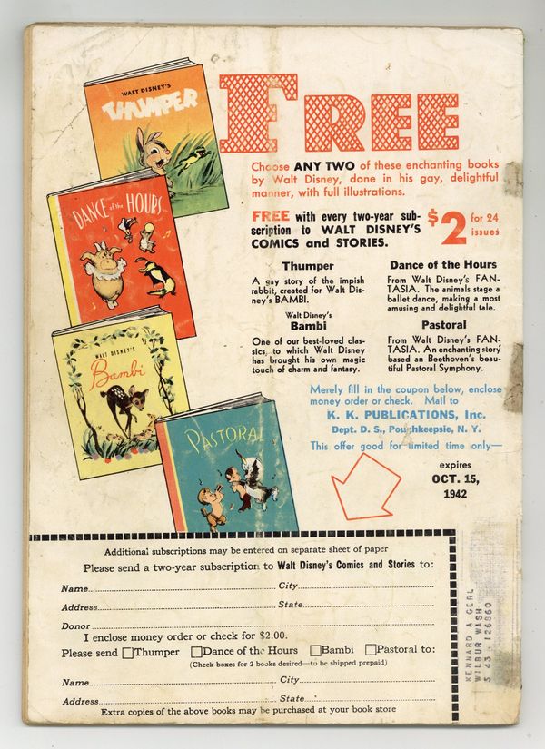 Starts Jan 19 Stories and art by Walt Kelly, Carl Barks, Floyd Gottfredson, Merrill De Maris, Bob Karp, Manuel Gonzales, Sylvia Holland, Bob Wright, Bob Grant, and Al Taliaferro. Sometimes listed as Vol. 3 #12. The long-running vehicle for Disney character comics featured early work by Carl Barks, the legendary Good Duck Artist. In a classic Floyd Gottfredson story from the Mickey Mouse comic strip, Mickey competes with Montmorency for Minnie's affections. In a story by Barks, Donald and his nephews compete to build the best animal traps, first for foxes, then wolves. In a story by Kelly, Gremlin Gus and the Widgets choose the wrong place to light a match. Plus a vintage ad for Disney's WWII propaganda film, Victory Through Air Power. The Mighty Trapper; Cousin Bertie; Financially Embarrassed; Carnival Fun; Contrary Condors; Weighty Wishes; Magic Stream; Alone at Last; The Gremlins; Mickey Mouse: Love Trouble; Hollywood Chatter; Tight Fit; Only His Hands Got Hot; Gentleman in Waiting; And Besides She's Left Handed; Two Strikes Is Out!; Faith, It's Wonderful; Bumpsy Daisy; Night Prowlers; It's Smart To Be Thrifty; #17 In The Ration Book; Strictly Legal; Donald Gets Stuck; He Was Warm; It's An Ill Wind; Empty Saddle; Time's Up!; The Retriever; Back to School; A Woman's Wiles; Plane Paper; On the Spot; Baby Needs New Shoes; Within the Law; Double Features; His Good Deed for the Day; A Hard Woman; Primer Page. 64 pages, Full Color. Cover price $0.10.