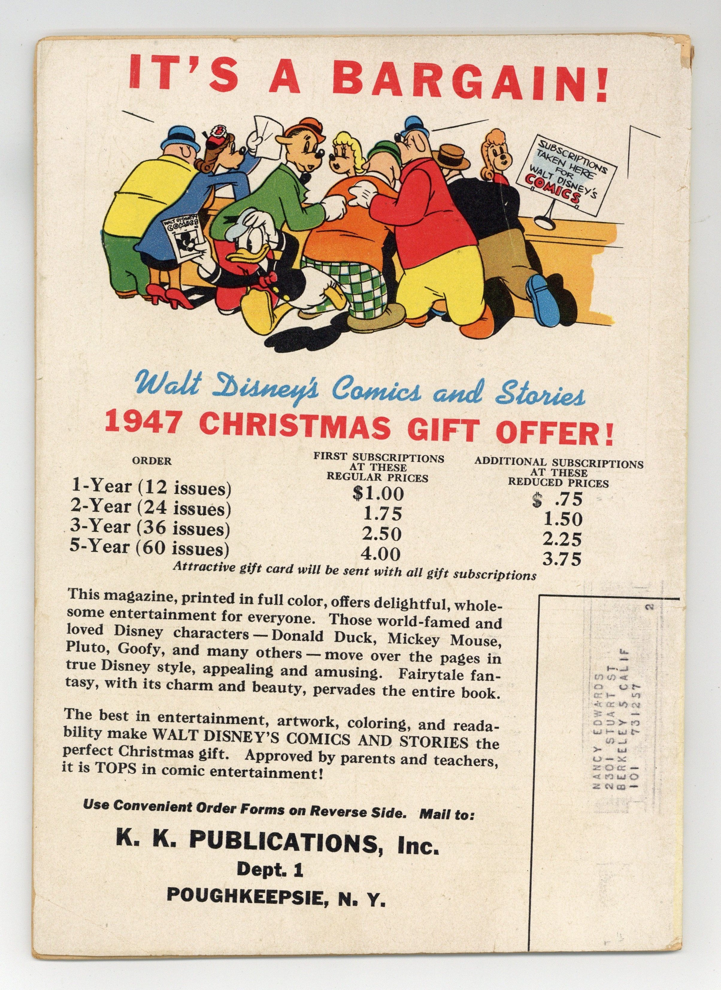 Starts Jan 3 Cover by Walt Kelly. Stories and art by Carl Barks, Floyd Gottfredson, Merrill De Maris, Bob Karp, Karl Karpe, Ralph Heimdahl, Paul Murry, Chase Craig, Gil Turner, Don Gunn, George Waiss, Bill Wright, Sylvia Holland, and Al Taliaferro. Sometimes listed as Vol. 7 #10. The long-running vehicle for Disney character comics featured work by Carl Barks, Floyd Gottfredson, and Pogo's Walt Kelly. In a classic story from the Mickey Mouse comic strip, Mickey matches wits with a mesmerist who uses his act for jewel theft. In a story by Barks, Donald is jealous of his nephews' card tricks, so he puts together a magic act of his own in an attempt to impress Daisy. A comics adaptation of Bongo, one of the segments in the Disney film Fun and Fancy Free. Donald Duck; Bucky Bug; Li'l Bad Wolf; Mickey Mouse; Bongo; For Rent Apply to Donald Duck; Bootle Beetle; Pluto's Lesson; Mickey Mouse: The Jewel Robbery. 48 pages, Full Color. Cover price $0.10.