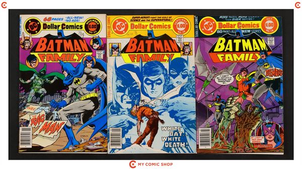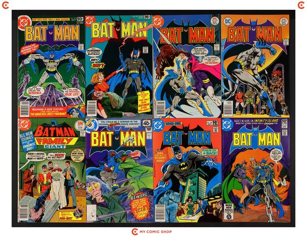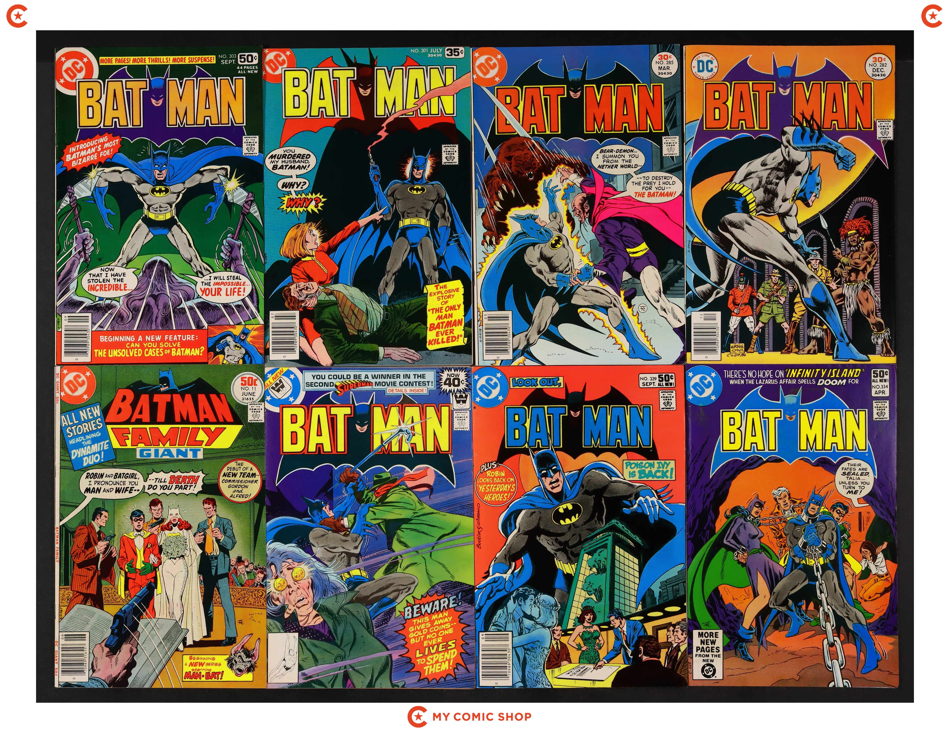 Issues 282, 285, 301, 303, 334, and 339N of Batman (1940), issues 11, 18, 19, 20 of Batman Family (1975 1st Series), and 307 of Batman (1940) Whitman. Most will grade in the VG to FN+ range.