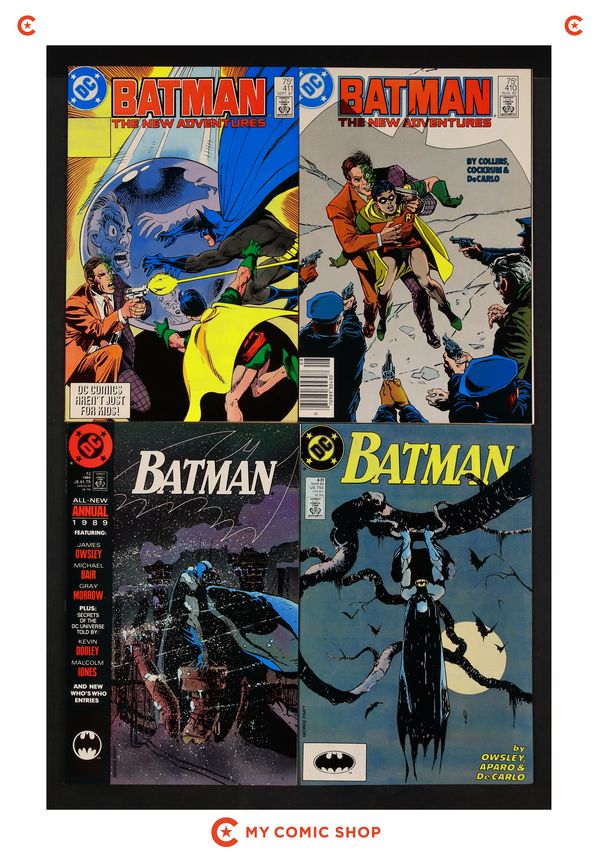 Issues 443, 446, 458, and 476-485 of Batman (1940); 1 of Batman Punisher (1994); 1 of Batman Spawn War Devil (1994); and 1 of Penguin Triumphant (1992). Most will grade in the VF range with a couple grading FN.