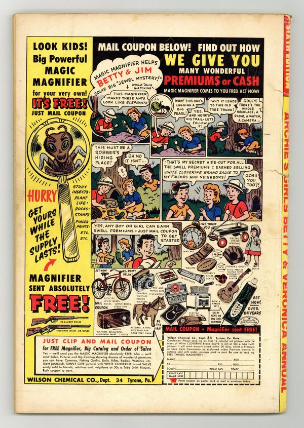Starts Jul 4 Cover pencils by Harry Lucey. "Poor Little Rich Girl," script by Frank Doyle, pencils by Dan DeCarlo, inks by Rudy Lapick; When Betty falls and hits her head at the Lodge Mansion, she gets the inspiration to pretend she thinks she's Veronica, hoping it will let her get a few dates with Archie. "A Matter Of Degree," script by Frank Doyle, pencils by Dan DeCarlo, inks by Rudy Lapick; Sick of Jughead's nasty comments about them because they're women, Betty and Veronica dress up as men to see if he'll react differently to them. "Scent-sational," pencils by Bill Vigoda; Veronica comes down with a virus and can't make the dance, so Betty volunteers to substitute and accompany Archie. "Rash Promise," script by Frank Doyle, pencils by Dan DeCarlo, inks by Rudy Lapick; Veronica forces Archie to ask Betty out on a pity date; Then the school moves the Fall Festival dance to that evening. "Sheer Nonsense," script by Frank Doyle, pencils by Dan DeCarlo, inks by Rudy Lapick; When Veronica insults Betty over her cheap, coarse stockings, Jughead gets an idea to give Betty a measure of payback. "Triple Threat," script by Frank Doyle, art by Samm Schwartz; In order to break up a shopping trip that Veronica has commanded Archie to attend, Betty plants two man-hungry coeds at the store and tells them that Archie is available. "Clean Defeat," script by Frank Doyle, pencils by Dan DeCarlo, inks by Rudy Lapick; Betty and Veronica compete to impress a handsome professional cleaner getting the Lodge Mansion in shape for Veronica's party. 82 pgs., full color. Cover price $0.25.