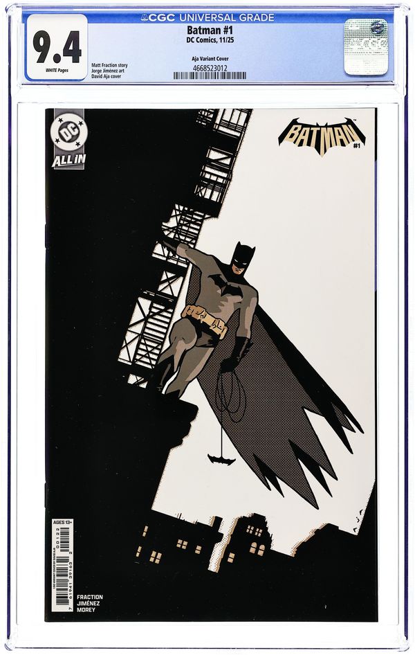 Starts Jan 19 Limited 1 for 50 Retailer Incentive Variant Cover. Written by Matt Fraction. Art by Jorge Jimenez. Cover by David Aja. A BOLD NEW ERA OF BATMAN STARTS HERE! A new day dawns for the Dark Knight Detective as Eisner Award-winning writer Matt Fraction (Hawkeye, Superman's Pal Jimmy Olsen) joins forces with superstar artist Jorge Jimenez (Batman, Summer of Superman Special) for an unforgettable new era of Batman! The best superhero in comics gets a brand-new first issue to kick off this new era that will test Batman and Bruce Wayne like never before! 40 pages, full color. Rated T+ Cover price $5.99.