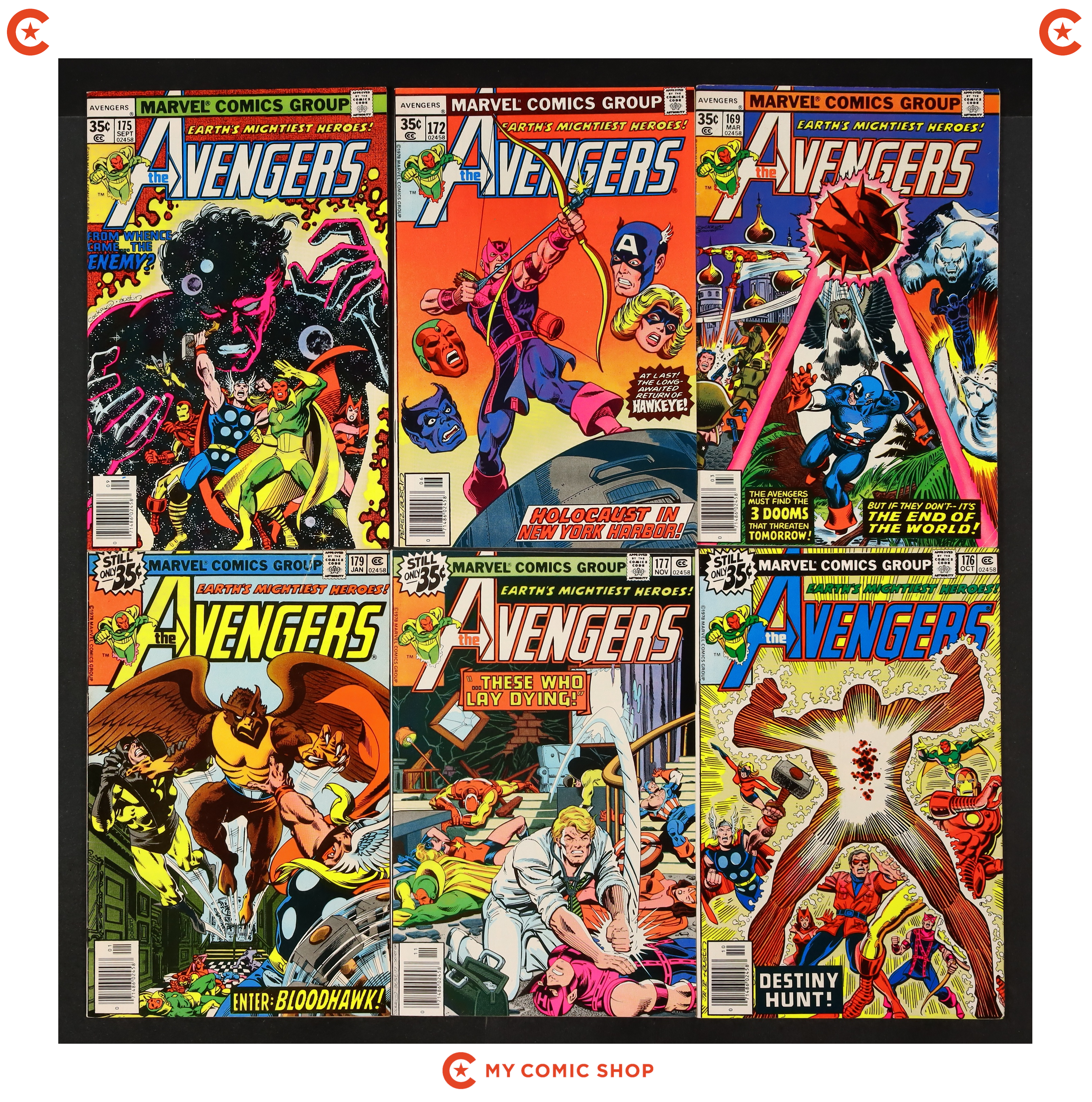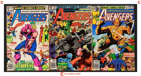 Issues 169, 172, 175, 176, 177, 179, 180, 188N, and 189N of Avengers (1963 1st Series). Most will grade in the VG to FN range.