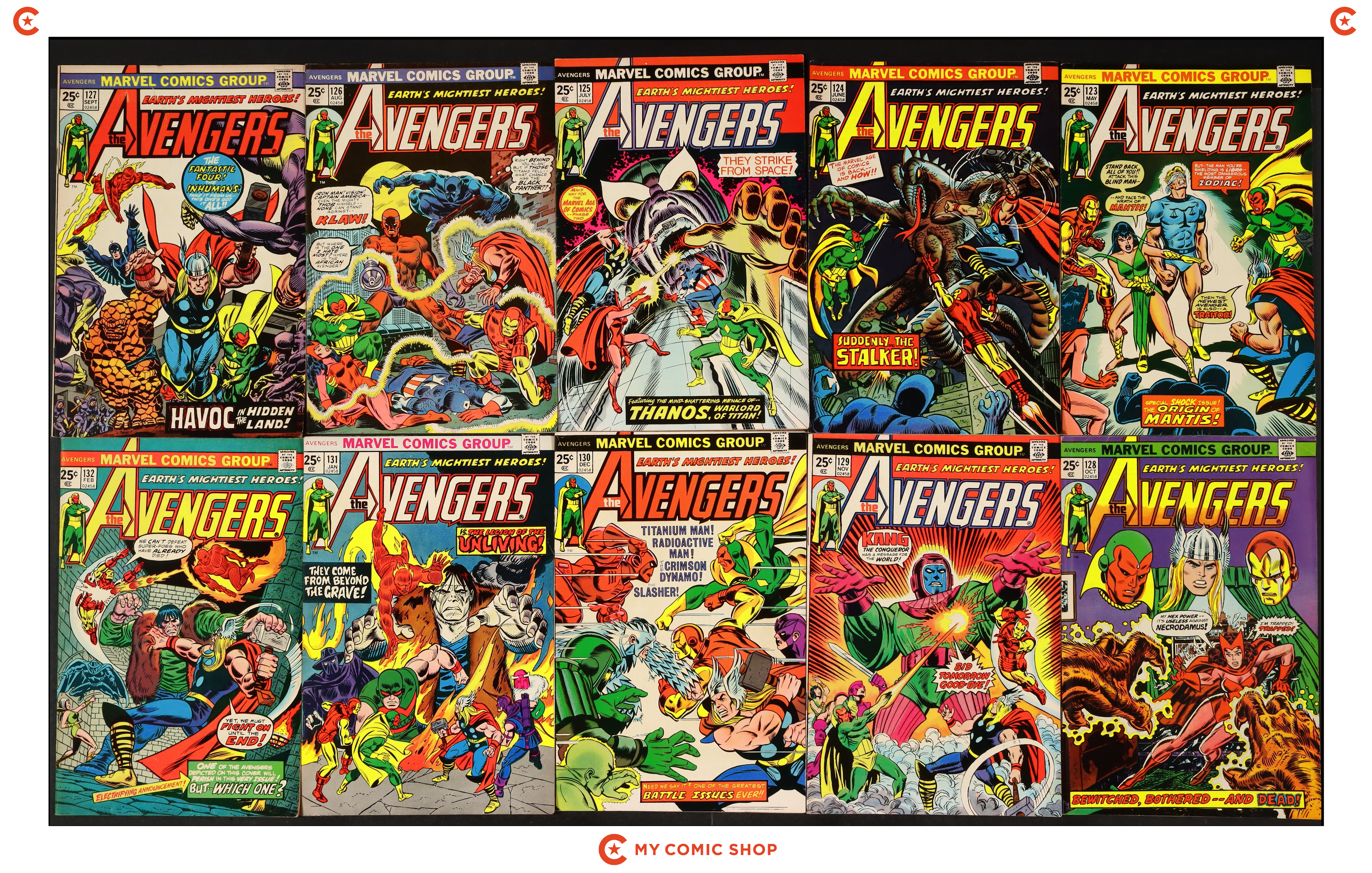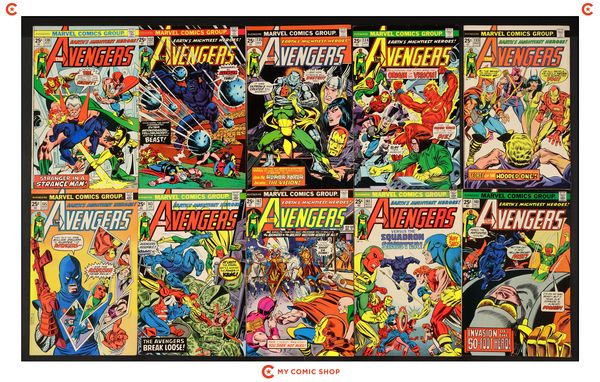 Issues 123, 124, 125, 126, 127, 128, 129, 130, 131, 132 of Avengers (1963 1st Series). Most will grade in the VG+ to FN range, with 123 and 124 grading at FR (Marvel value stamp removed).
